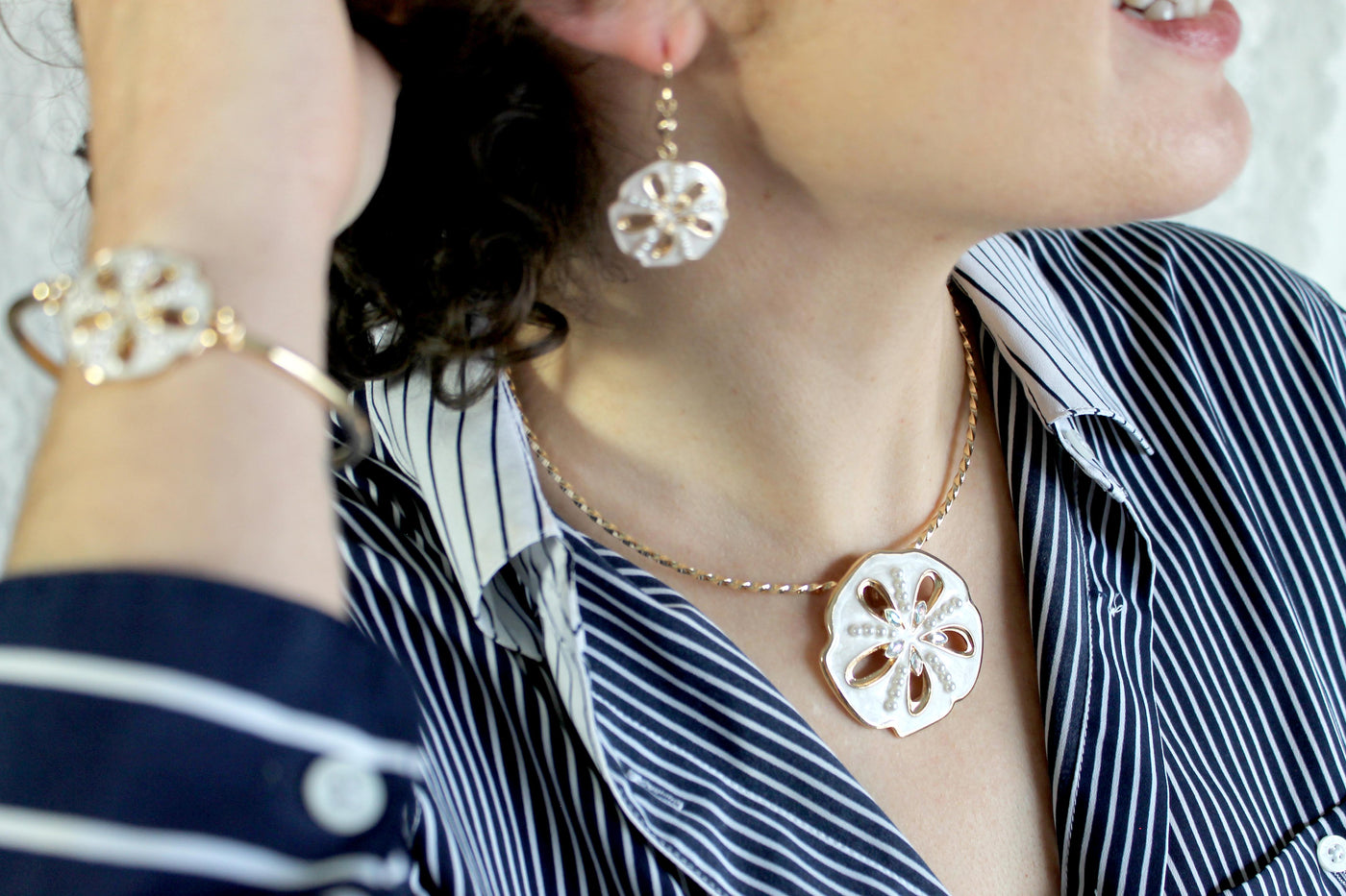 Available as a pin/pendant, stud earrings, cuff bracelet, and 17" necklace.