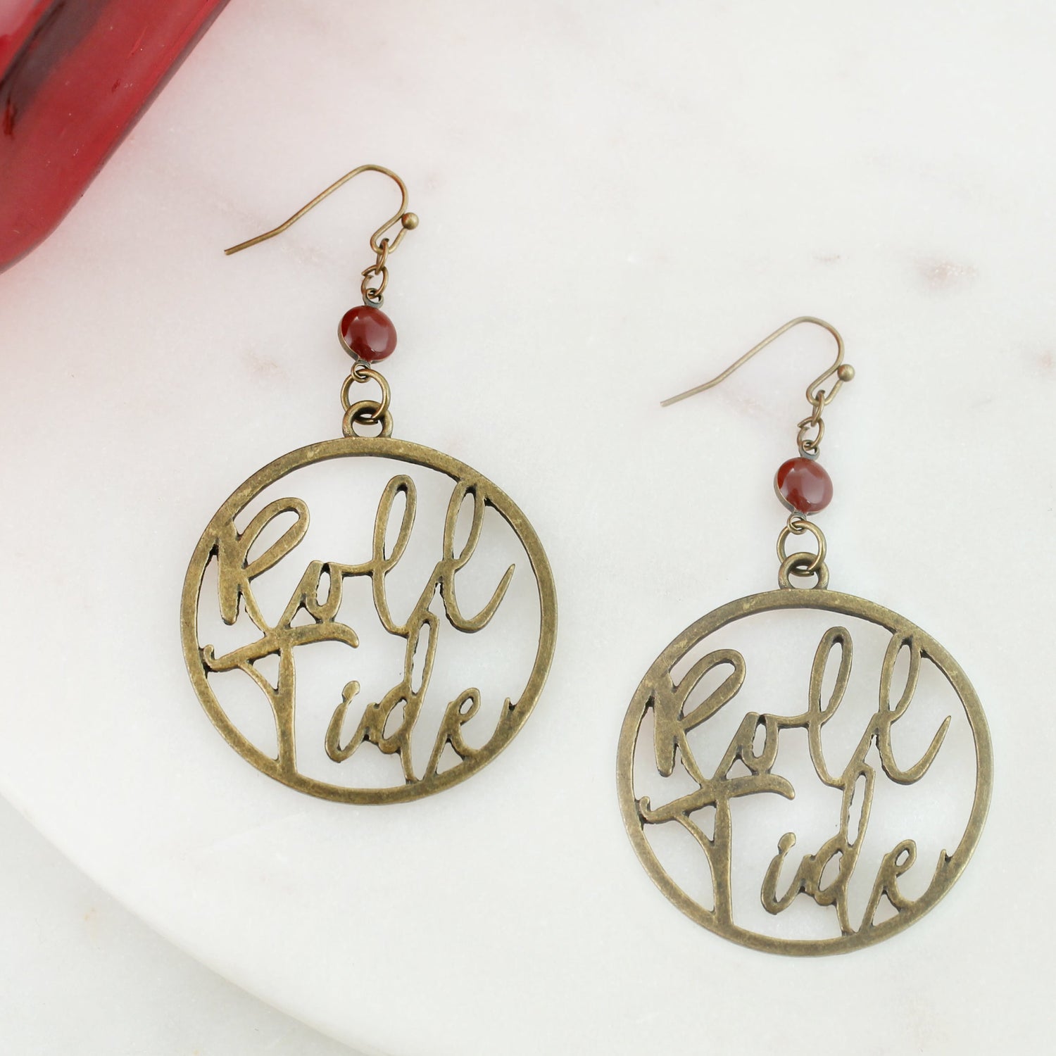 These fan-favorite Roll Tide earrings feature an open-cut design in antique brass tone with a crimson enamel bead at the top. Lightweight and full of spirit, they’re a fun addition to your game day wardrobe. Pair them with our matching cutout slogan necklace for a complete Bama fan look!