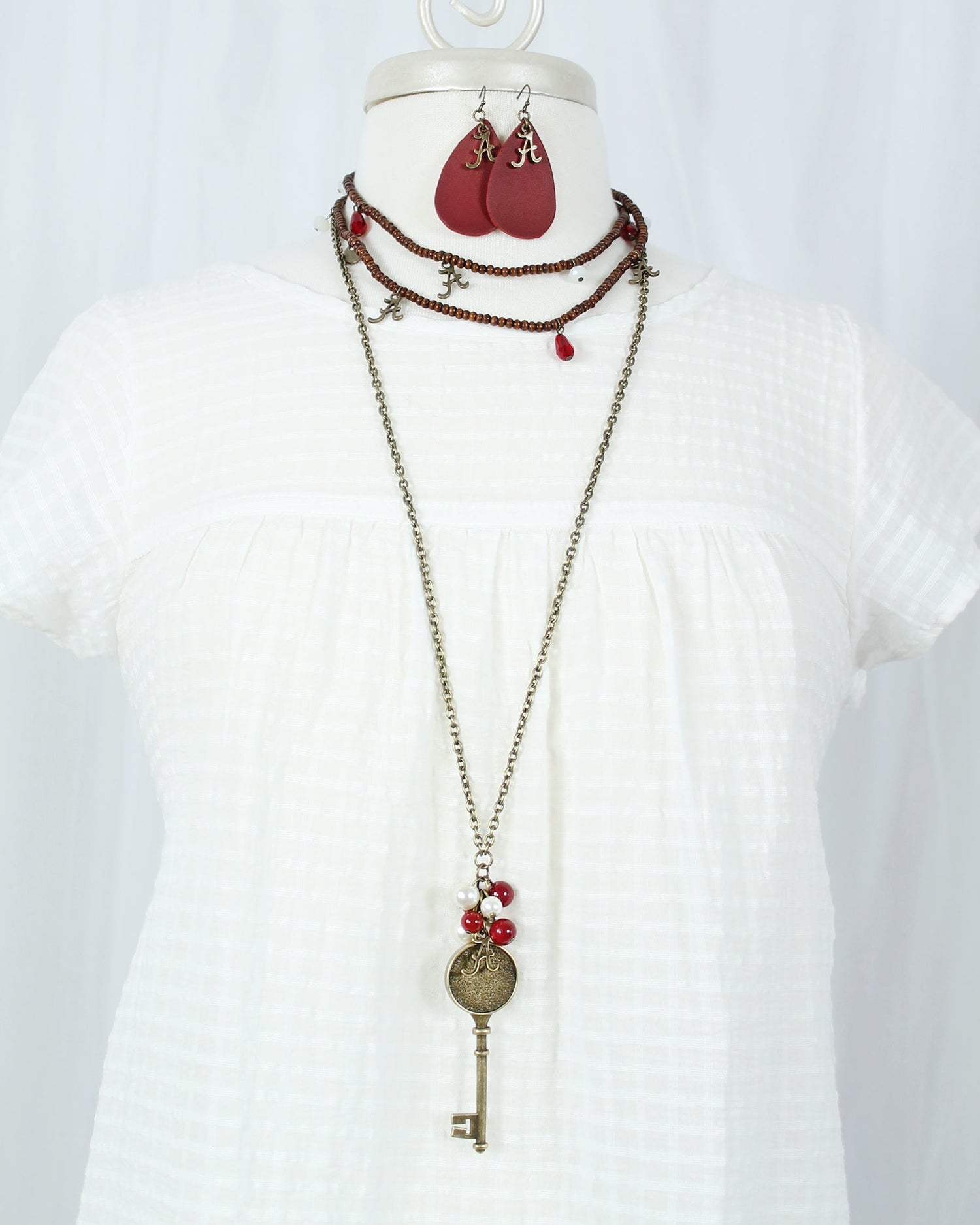 36” in length, this wood bead stretch necklace features crimson and white beads, with Alabama logo charms in our signature vintage tone. Wear as a long necklace, doubled or tripled as a short necklace, or wrapped short as a bracelet.