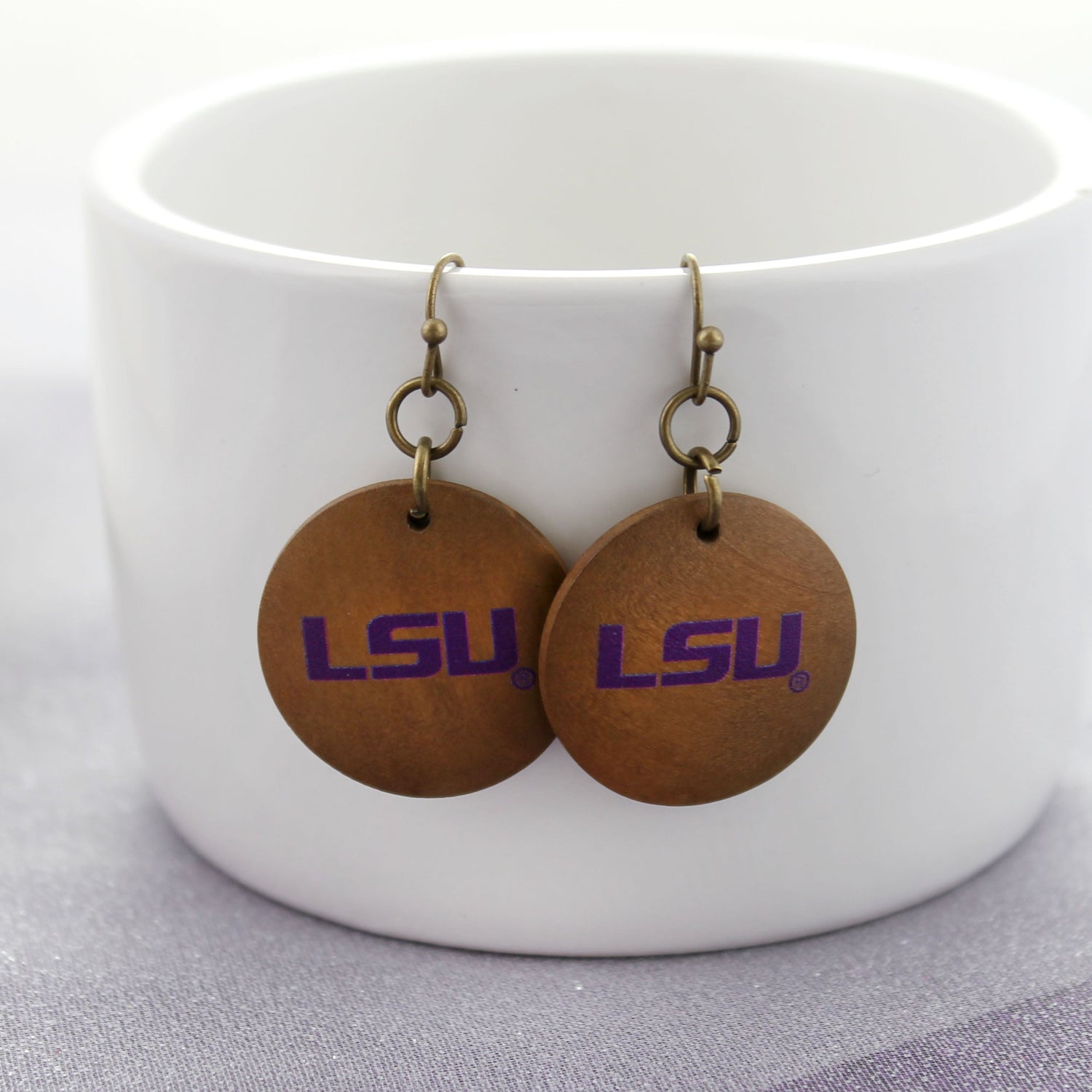 These Louisiana State University earrings feature “LSU” logos on lightweight wood discs with antique brass hardware. The design is ultra-light for all-day comfort. Matches perfectly with our coordinating wood and pearl bracelet and long necklace.