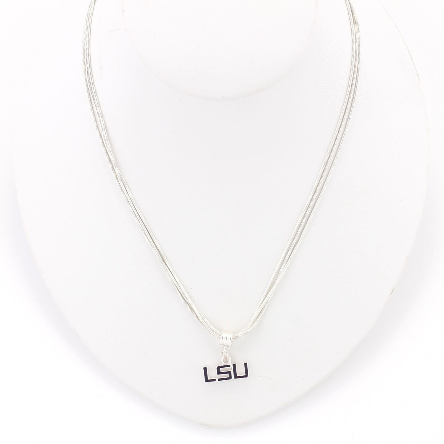 This 16" necklace features an enamel LSU logo on a three strand silver tone necklace.