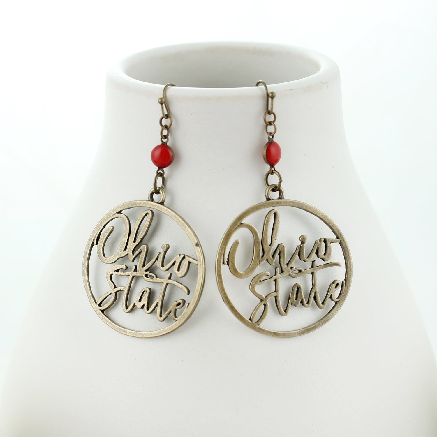 These fan-favorite Ohio State earrings feature an open-cut design in antique brass tone with a red enamel bead at the top. Lightweight and full of spirit, they’re a fun addition to your game day wardrobe. Pair them with our matching cutout slogan necklace for a complete OSU fan look!