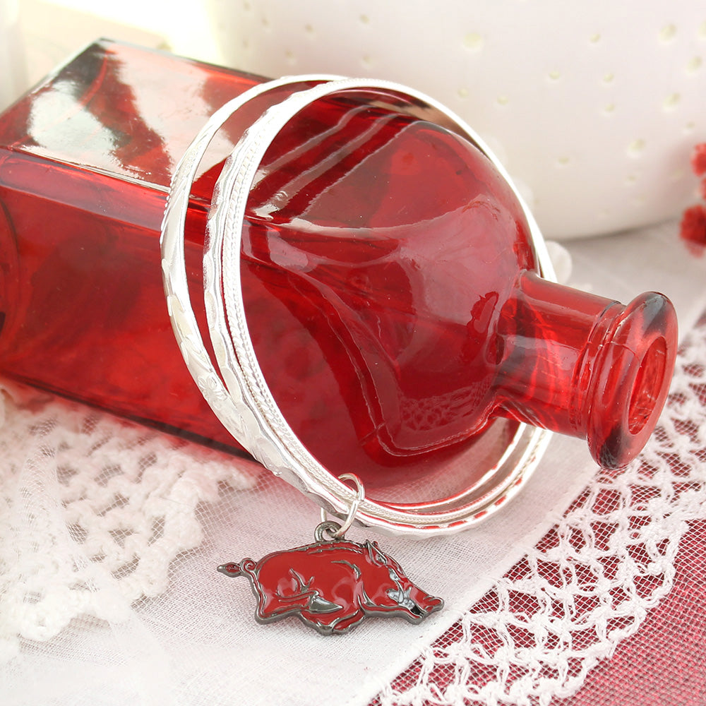 Three silver tone bangle bracelets with a single red enamel Arkansas Razorbacks logo charm.