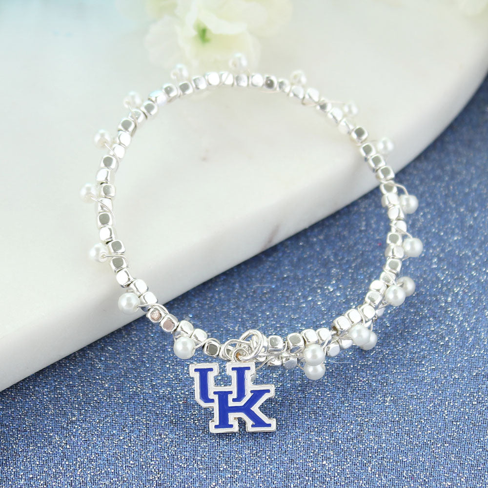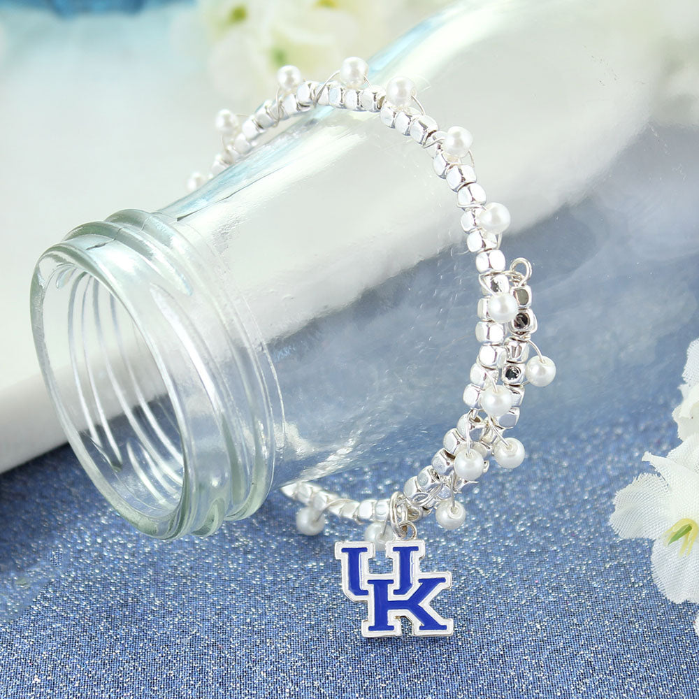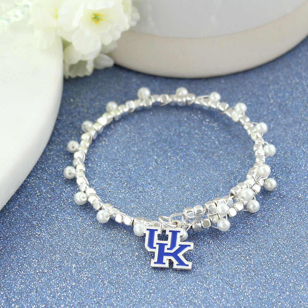 Silver tone wrap bracelet wrapped in small silver and imitation pearl beads with a blue and white enamel Kentucky logo charm.
