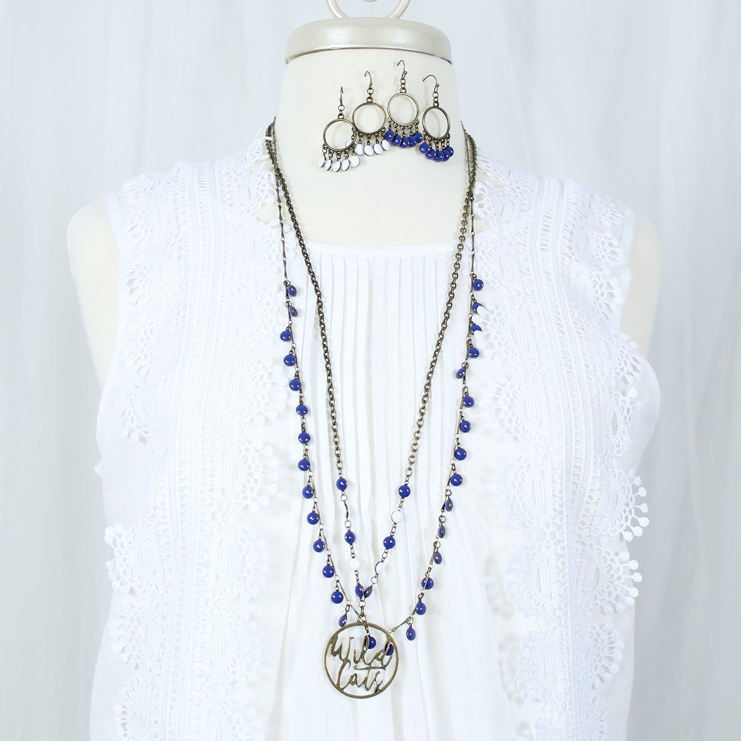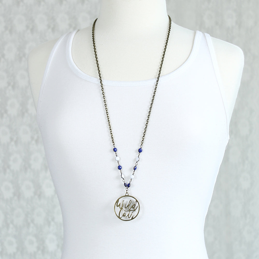 This statement necklace features a large antique brass tone “Wildcats” cutout charm with blue and white enamel bead accents on a matching linked chain. A spirited accessory that pairs perfectly with our cutout earrings or layers well with our Kentucky enamel dot necklace.