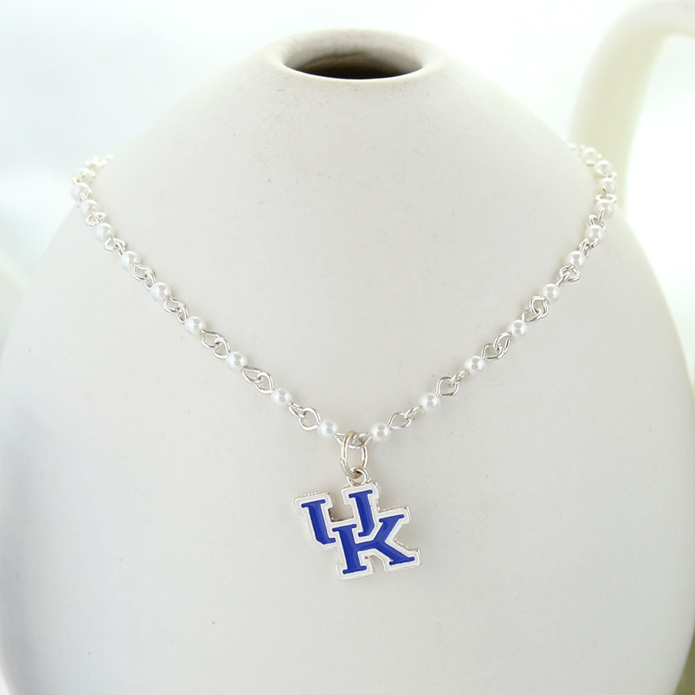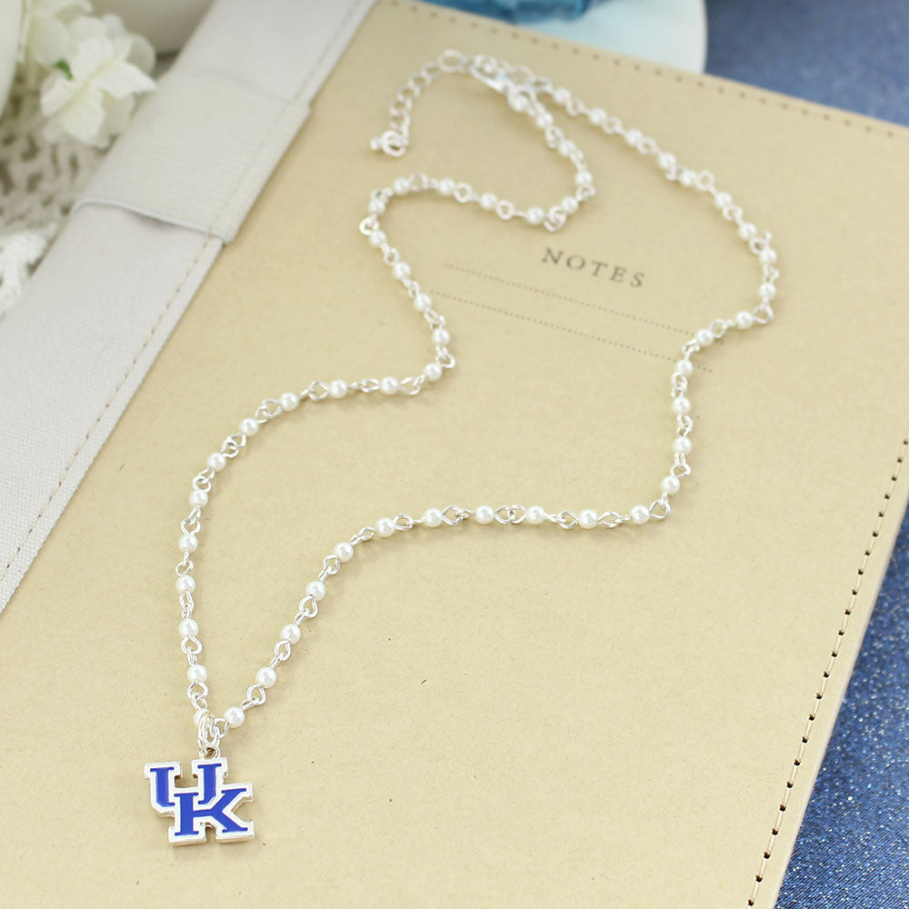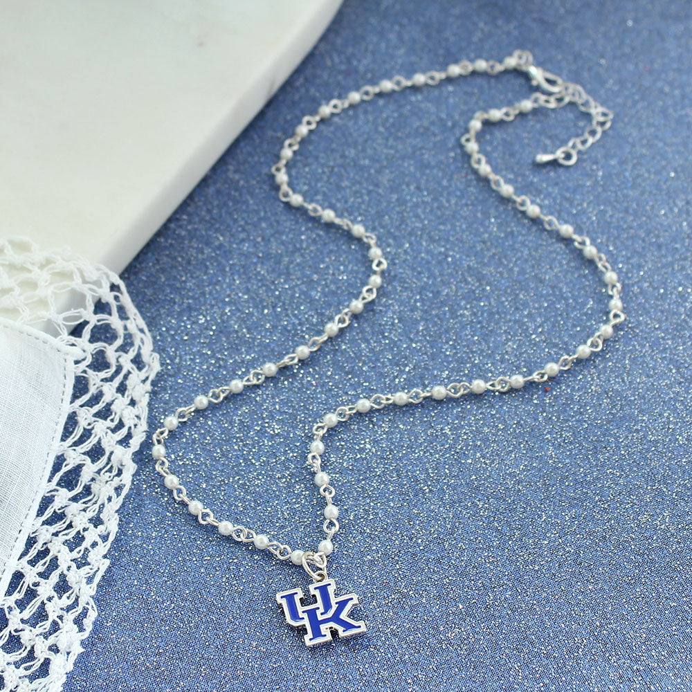 18” in length, this silver tone chain with tiny imitation pearl accents features a blue and white enamel Kentucky logo charm.