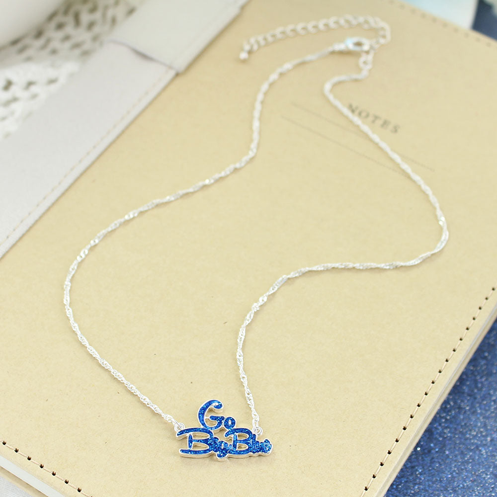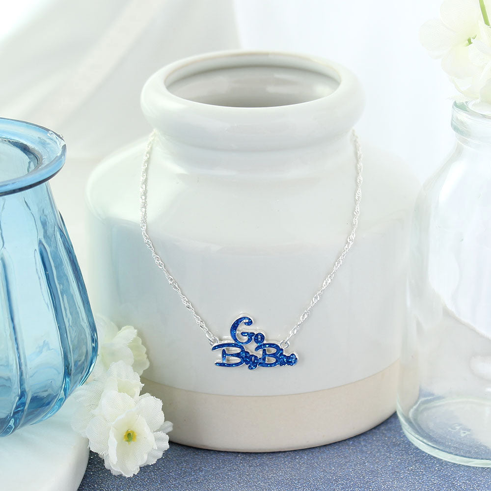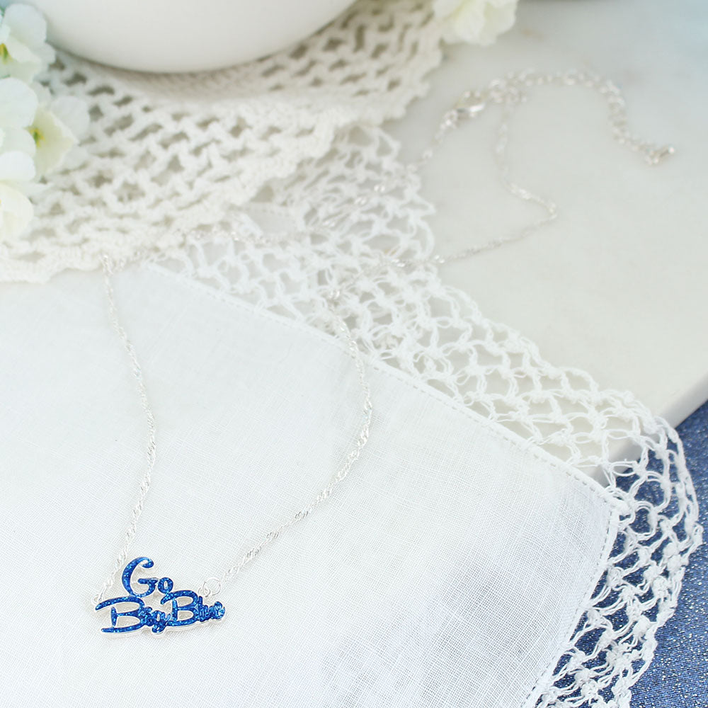 Show your team spirit with this blue glitter enamel “Go Big Blue” necklace, featuring an eye catching script font on a silver tone rope chain. Whether worn solo or stacked with other game day favorites, this necklace delivers subtle sparkle. Coordinates with the full “Go Big Blue” glitter enamel collection—bracelet, earrings, and pin.