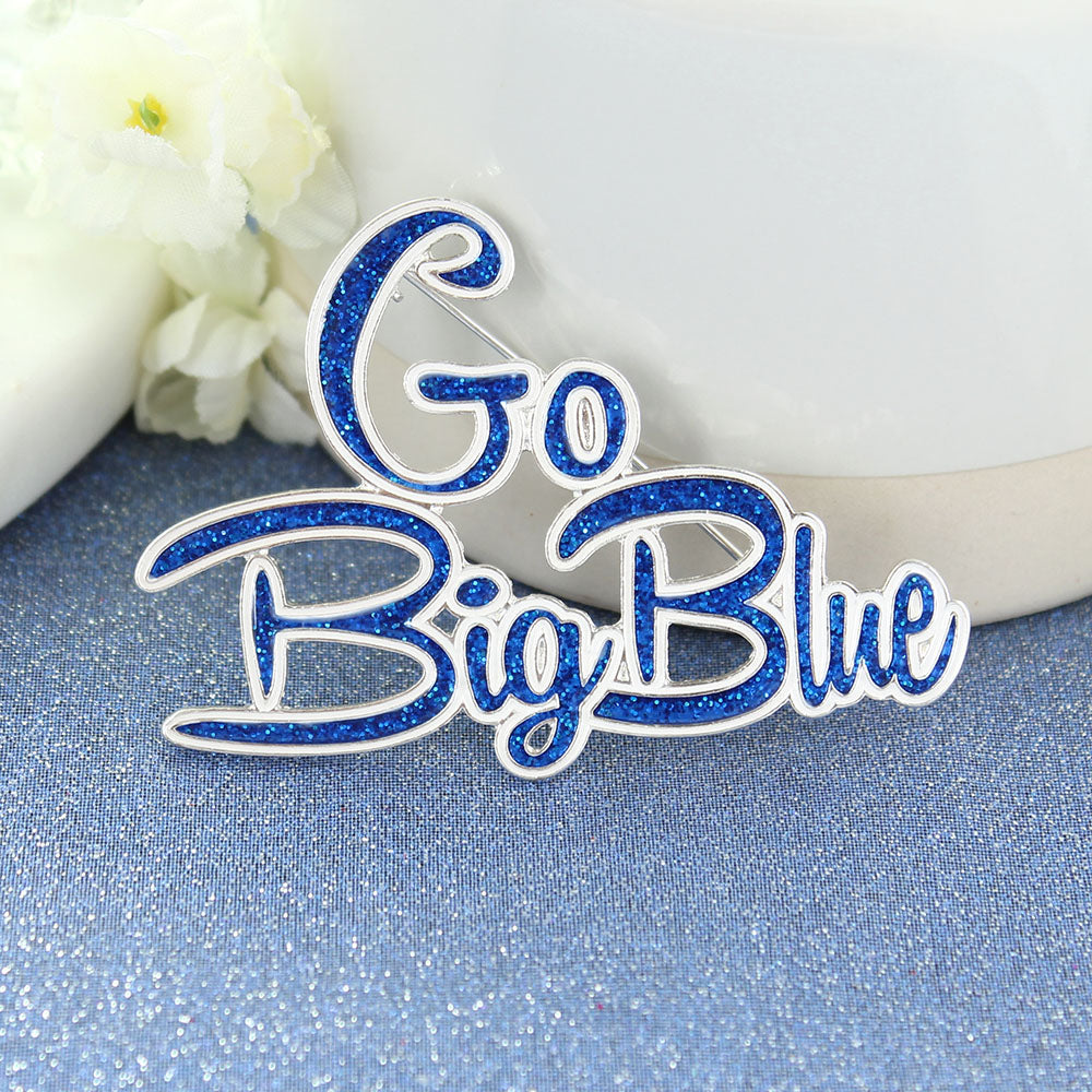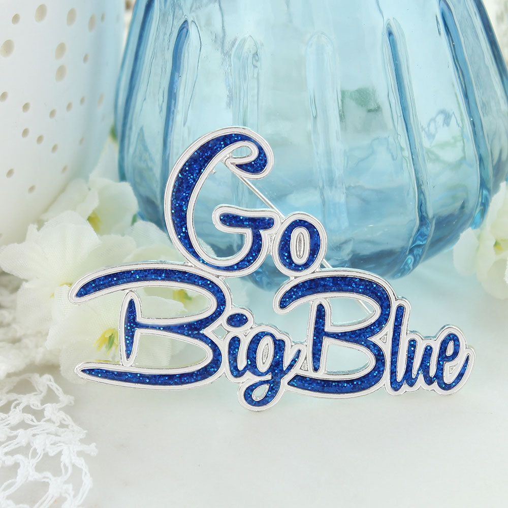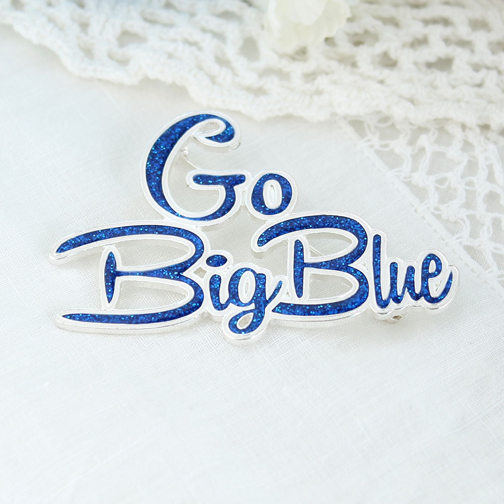 This eye-catching “Go Big Blue” pin features our signature glitter enamel in a bold script font. Measuring approximately 2.5” wide, it includes a standard pin back and adds a spirited pop to crossbody bags, visors, scarves, jean jackets, and more. Lightweight yet durable, it’s perfect for game day flair. Coordinates with the matching bracelet, earrings, and necklace.