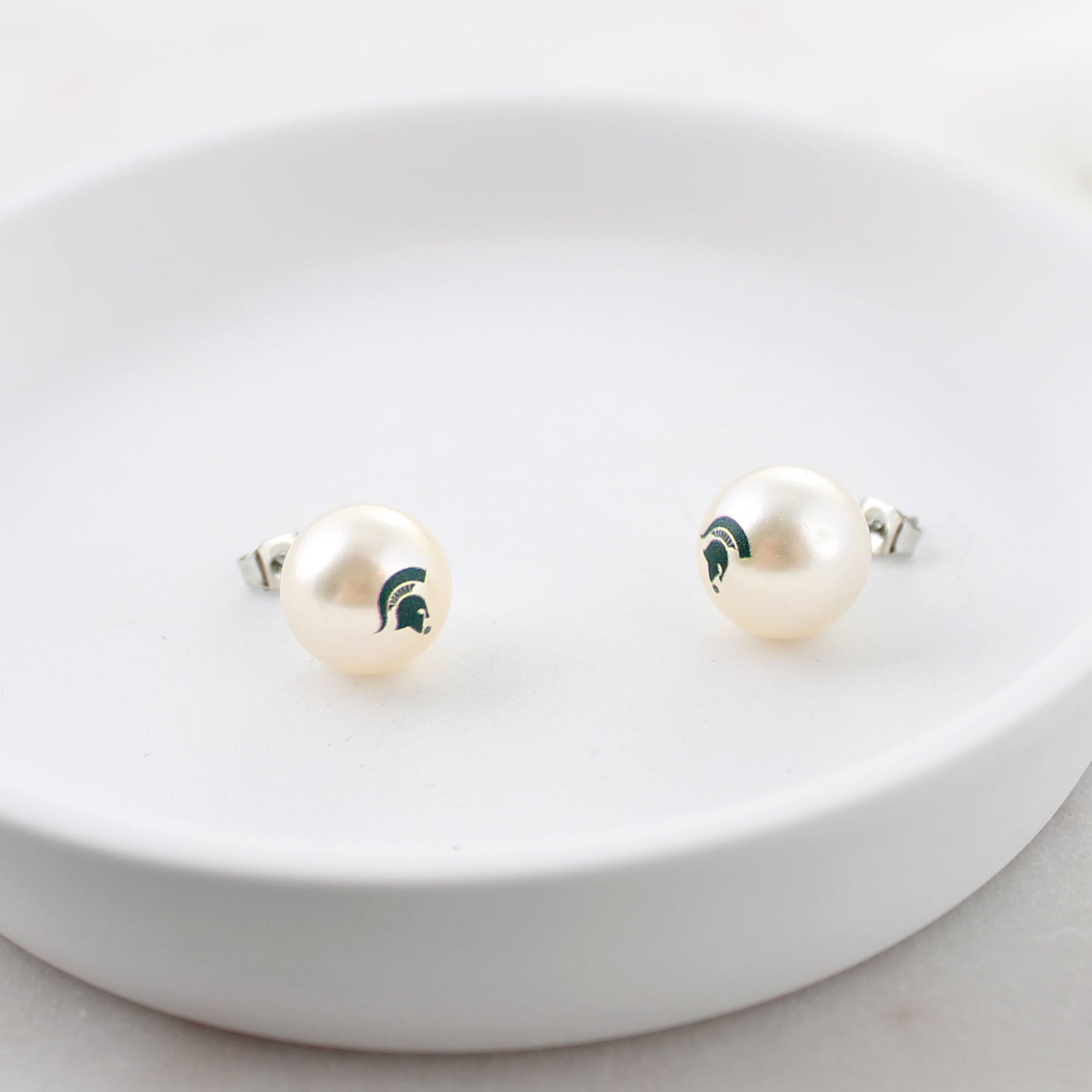 These elegant Michigan State University pearl stud earrings feature 12mm round imitation pearls adorned with the iconic Spartan helmet logo. Set on silver tone posts with secure backs, they are lightweight, comfortable, and perfect for dressing up your game day look or showing everyday State pride. Pairs beautifully with other pieces from our MSU jewelry collection!