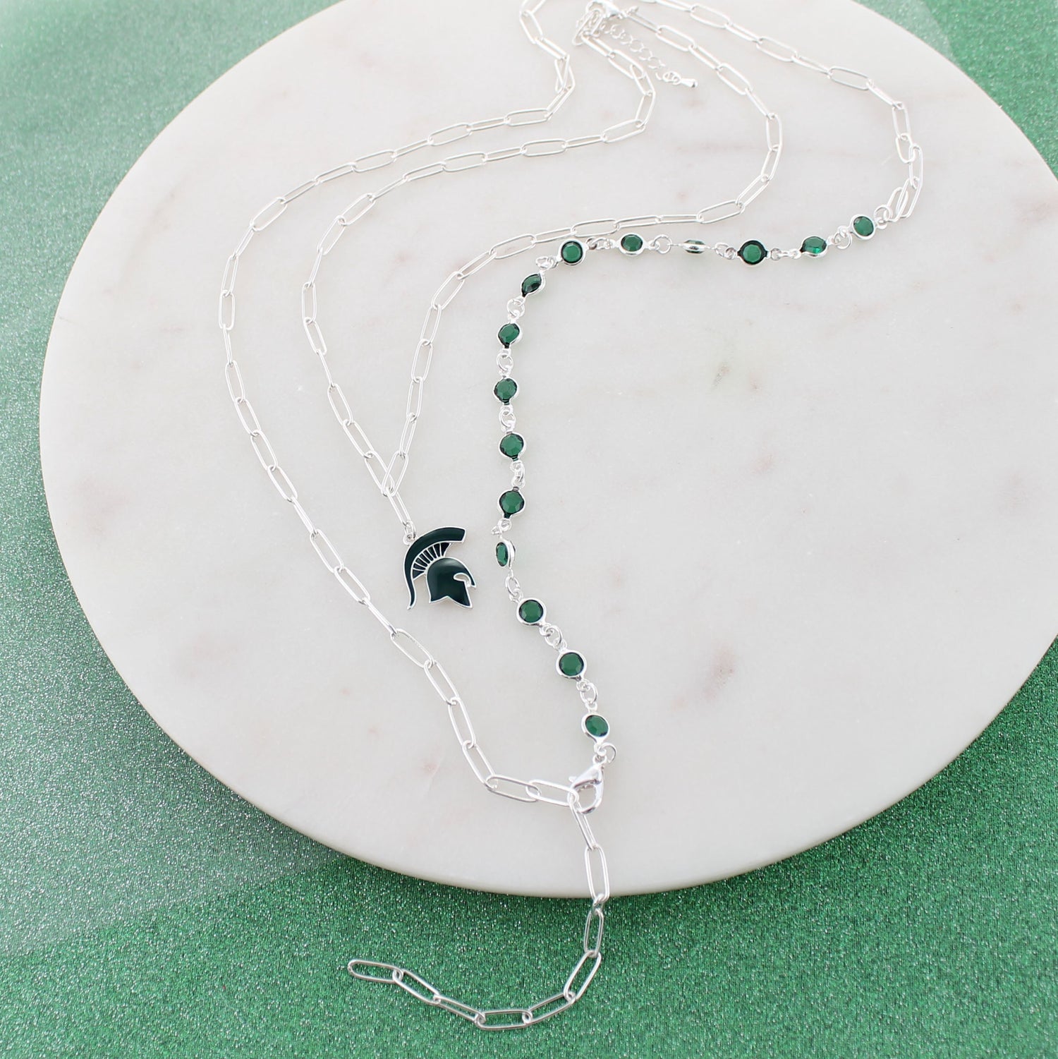 This versatile set includes two separate silver tone necklaces. One with green faceted crystals and one classic paperclip chain featuring a Michigan State Spartans logo charm. Each strand has its own claw clasp, so you can wear them layered or separately for multiple looks.