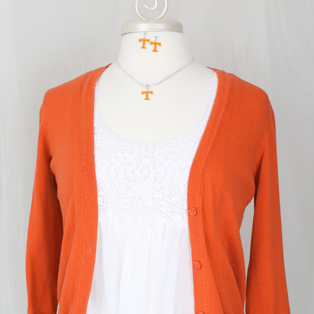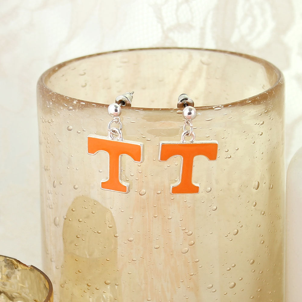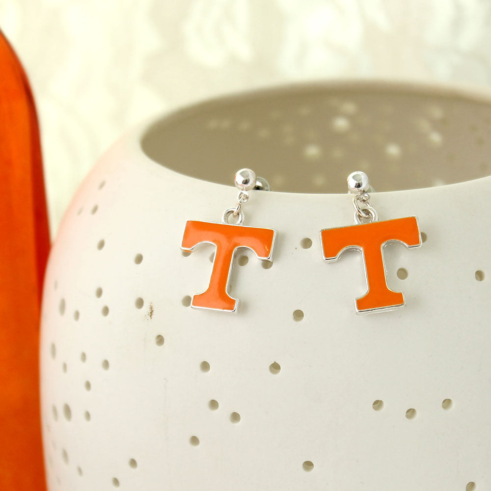 These silver tone University of Tennessee drop earrings feature the classic Power T enamel logo in orange and silver on lightweight post backs. A bold yet easy-to-wear design, they pair perfectly with other enamel pieces from our UT collection. Whether for game day or campus life, they bring your Vols pride to life!