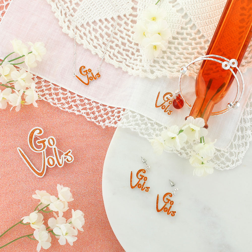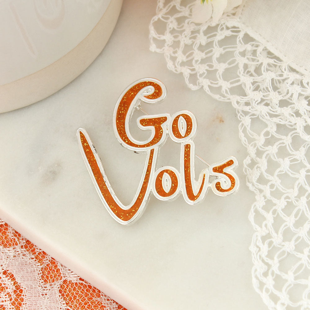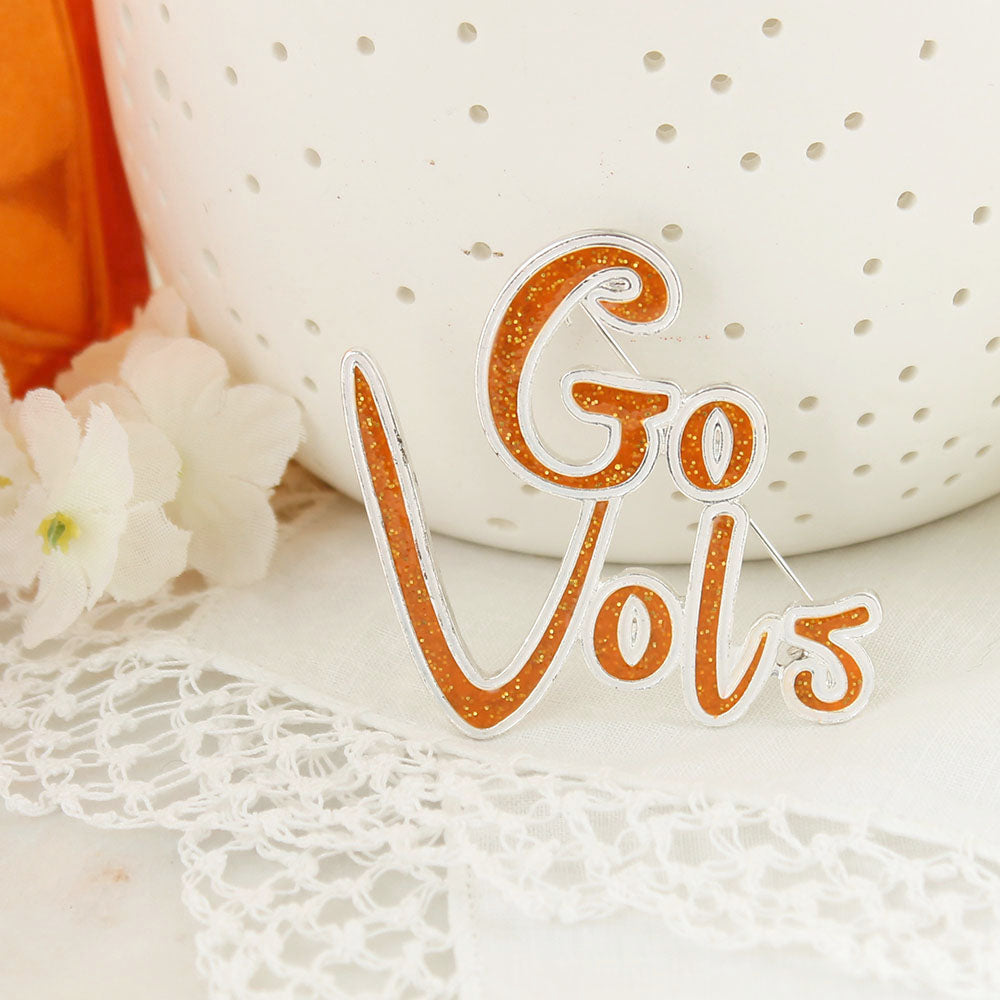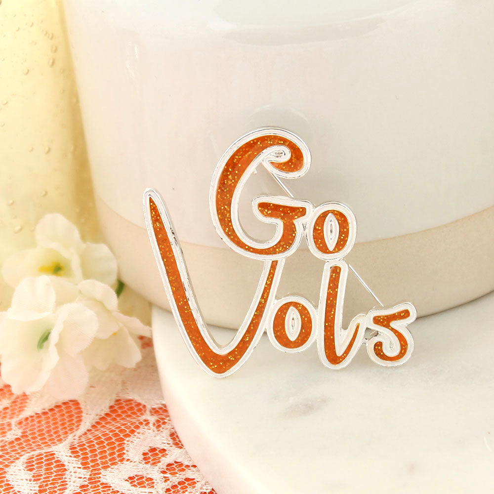 This eye-catching “Go Vols” pin features our signature glitter enamel in a bold script font. Measuring approximately 2.25” wide, it includes a standard pin back and adds a spirited pop to crossbody bags, visors, scarves, jean jackets, and more. Lightweight yet durable, it’s perfect for game day flair. Coordinates with the matching bracelet, earrings, and necklace.