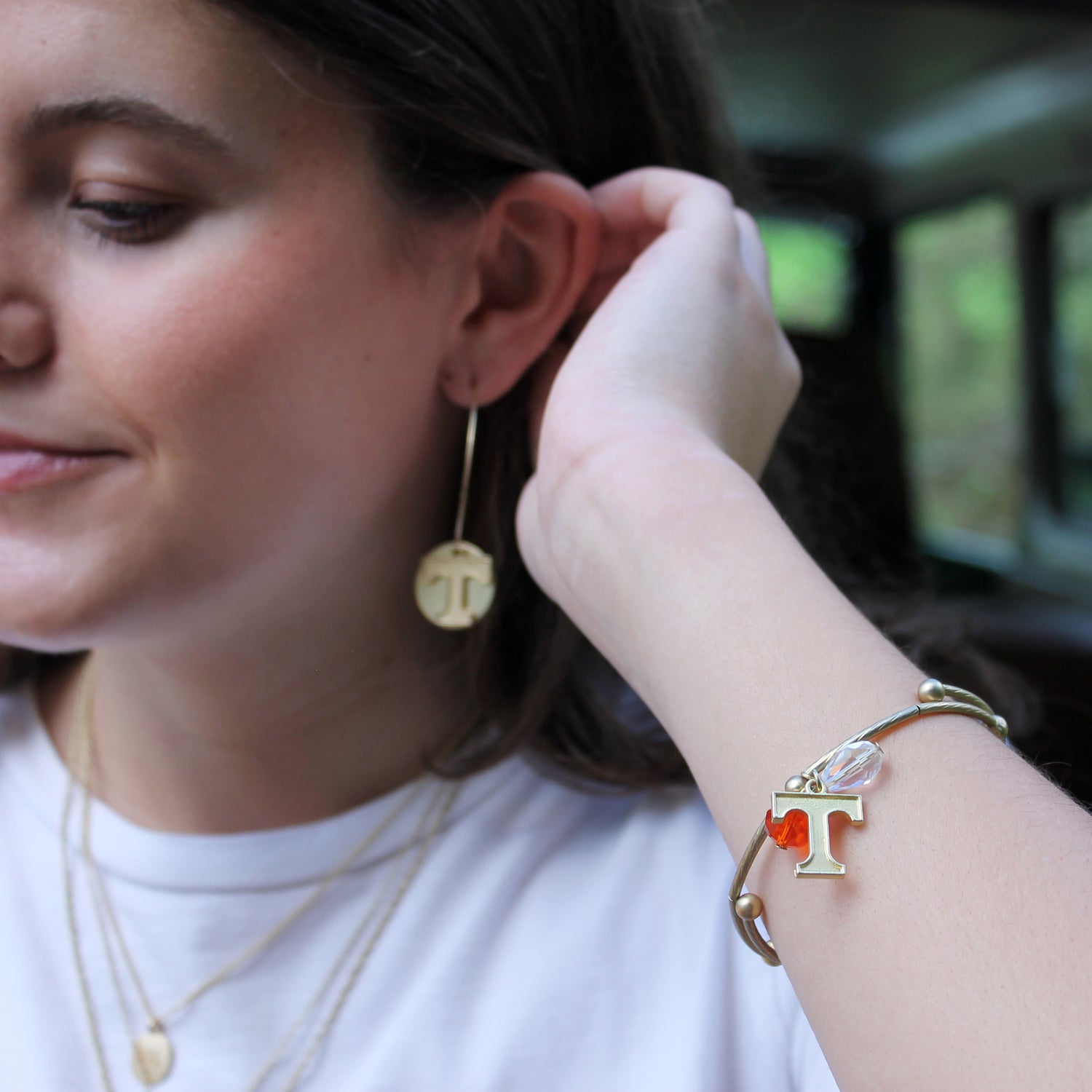 This gold tone UT charm bracelet features a beaded wrap bangle design with a dangling Tennessee Power T logo charm and bold orange and clear faceted bead accents. Lightweight and flexible, it’s great on its own or stacked with other pieces. An easy way to show team spirit with a modern twist. Fits wrist sizes of 5.5 - 8". Cluster dangles .75" below bracelet. The wrap style makes this piece easy to put on and take off!