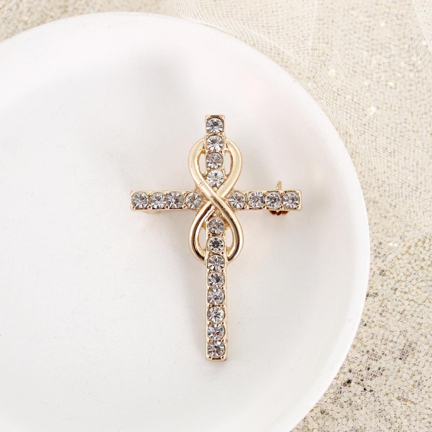 Gold tone pin/pendant featuring a crystal infinity cross design. Pin/pendant features a snap-closure clasp and measures 2 inches in height.