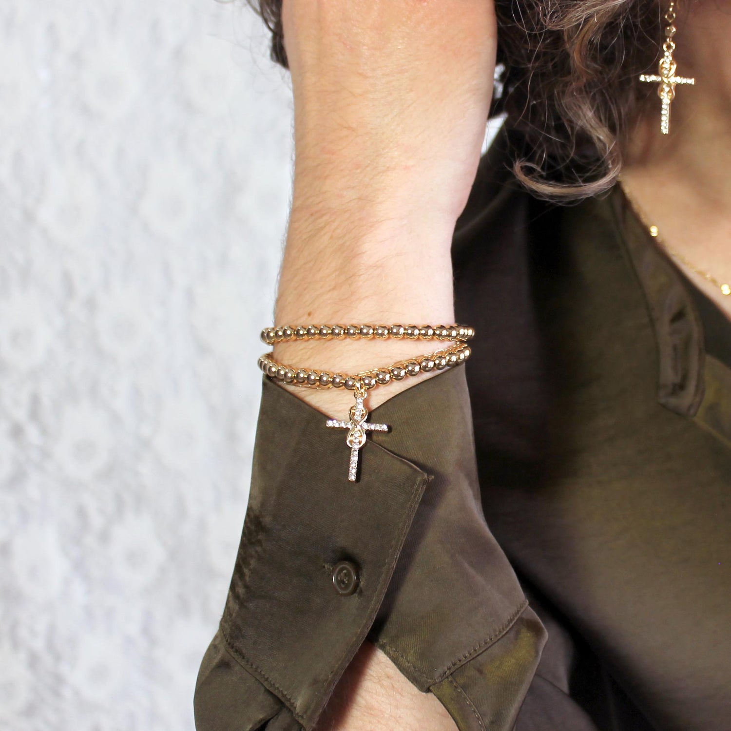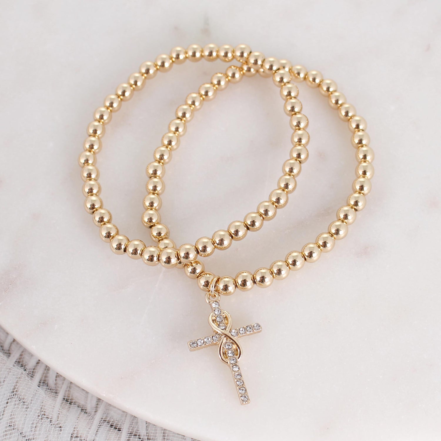 Set of two gold tone stretch bead bracelets with a crystal infinity cross dangling off on one. Cross measures an inch in height. Bracelets can be worn individually, or together for a stacked look.