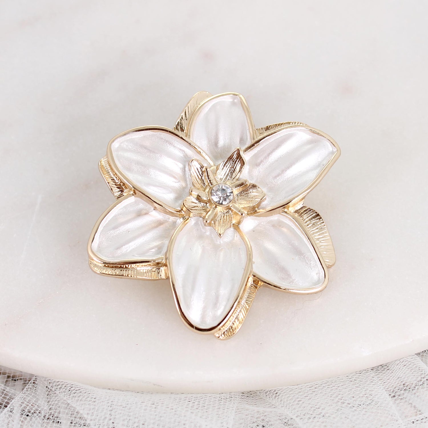 Gold tone pin/pendant featuring an enamel Easter Lily design with a crystal accent in the center. Pin/pendant features a magnetic clasp and measures 2 inches in size.