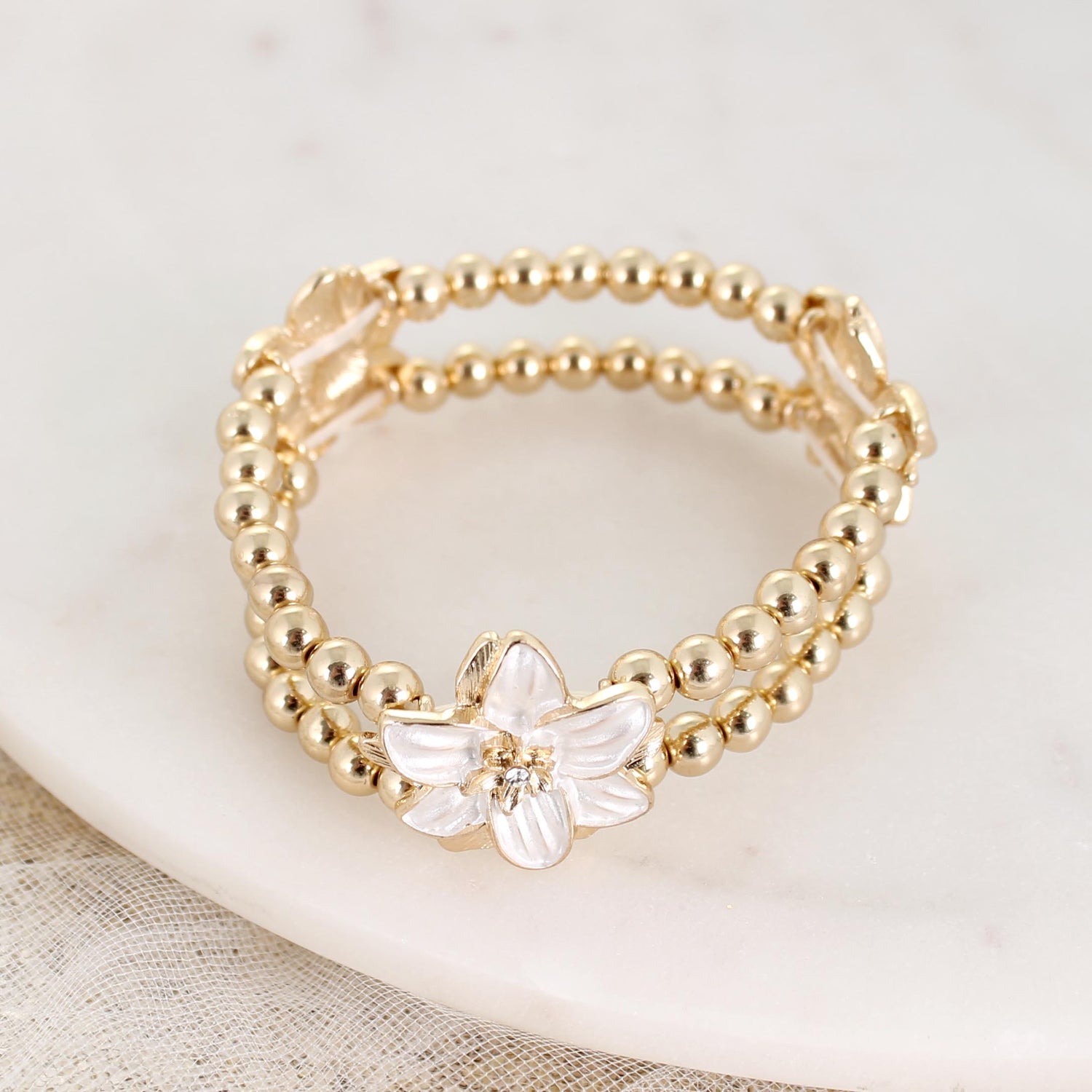 Double stretch bead strand of gold tone beads with three enamel Easter Lily charms positioned equally within the bracelet. Each Easter Lily has a crystal accent for subtle sparkle., and measures an inch in size.