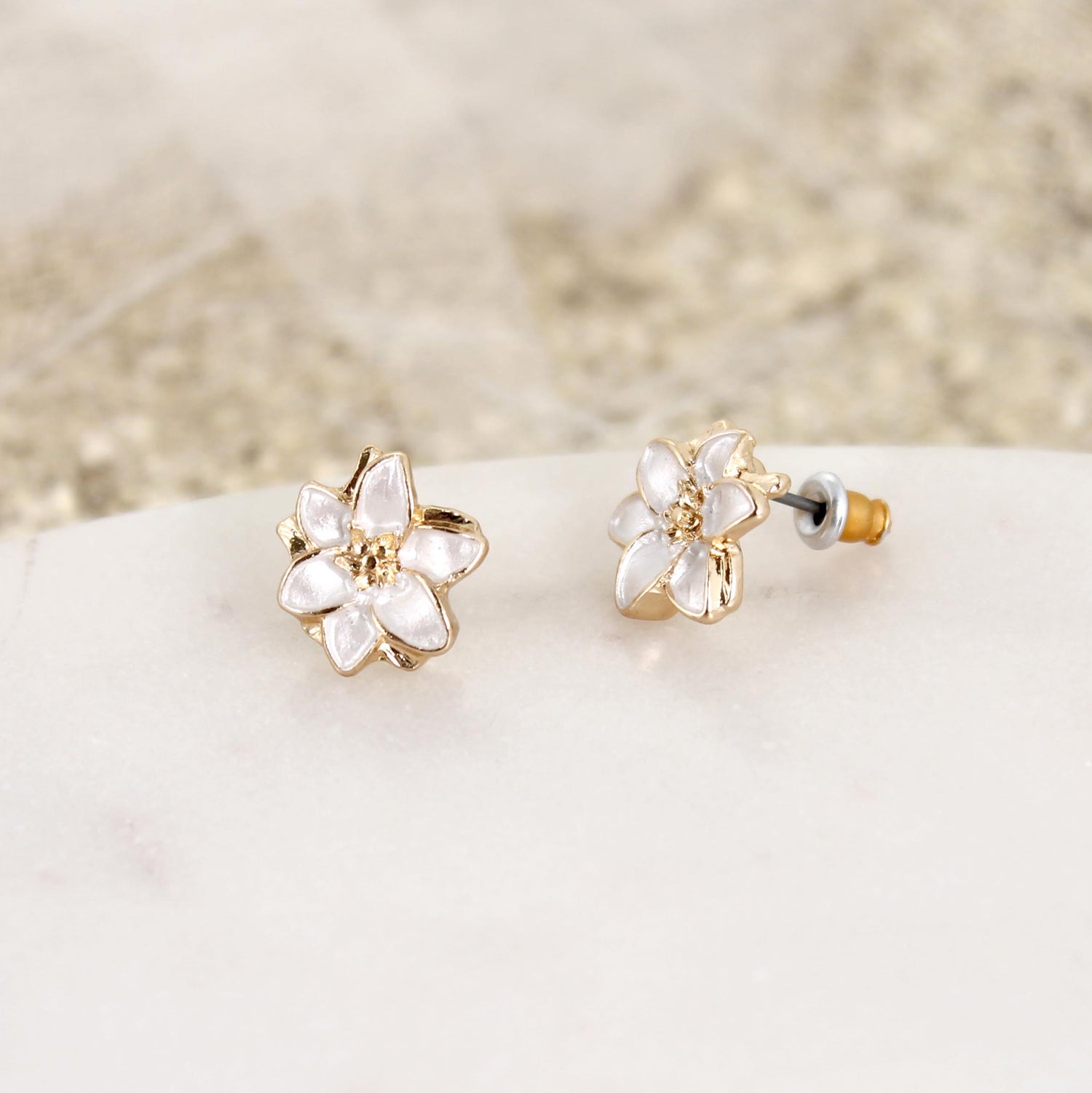Gold tone stud earrings featuring an enamel Easter Lily design. Flowers measure a half inch in size.