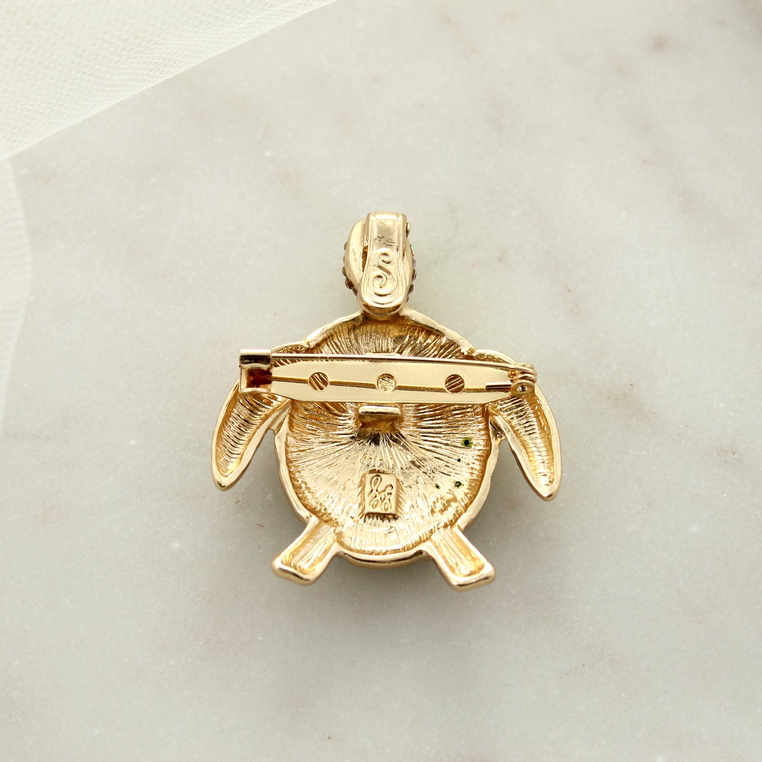 Gold tone pin/pendant featuring a sea turtle with crystal accents. Pin/pendant features a magnetic clasp and measures 2.25 inches in height.