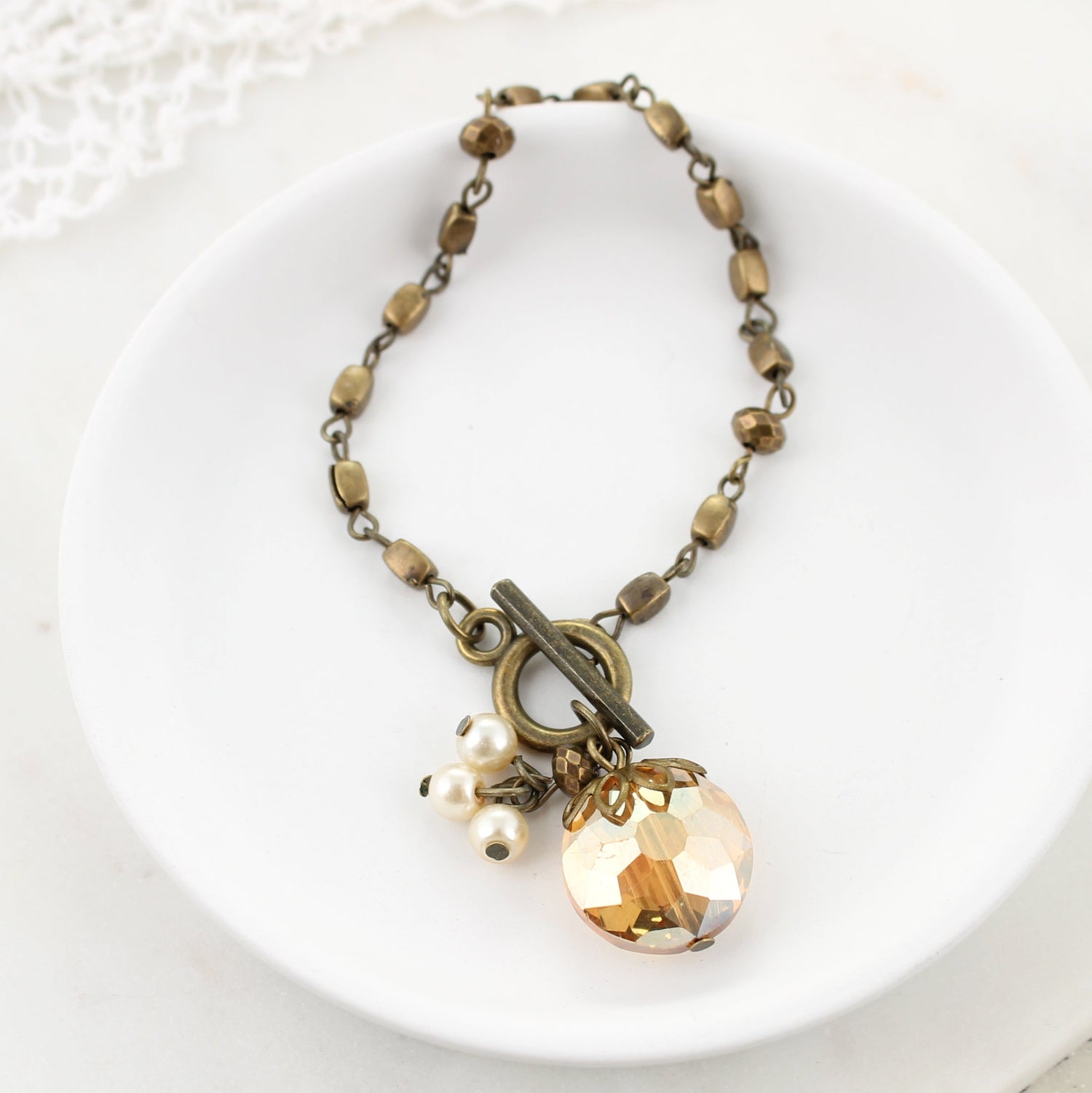 Vintage tone toggle clasp bracelet featuring a peach crystal and imitation pearl bead accents.