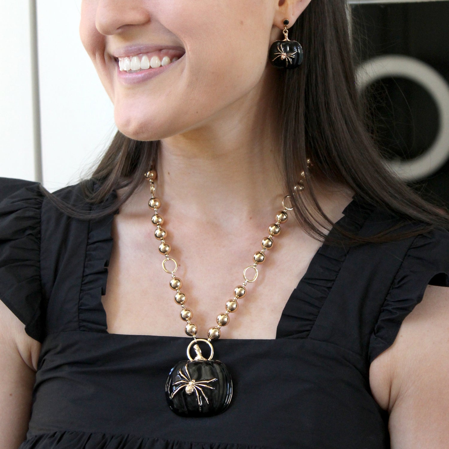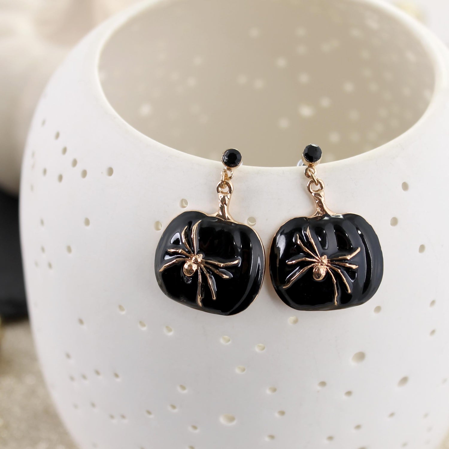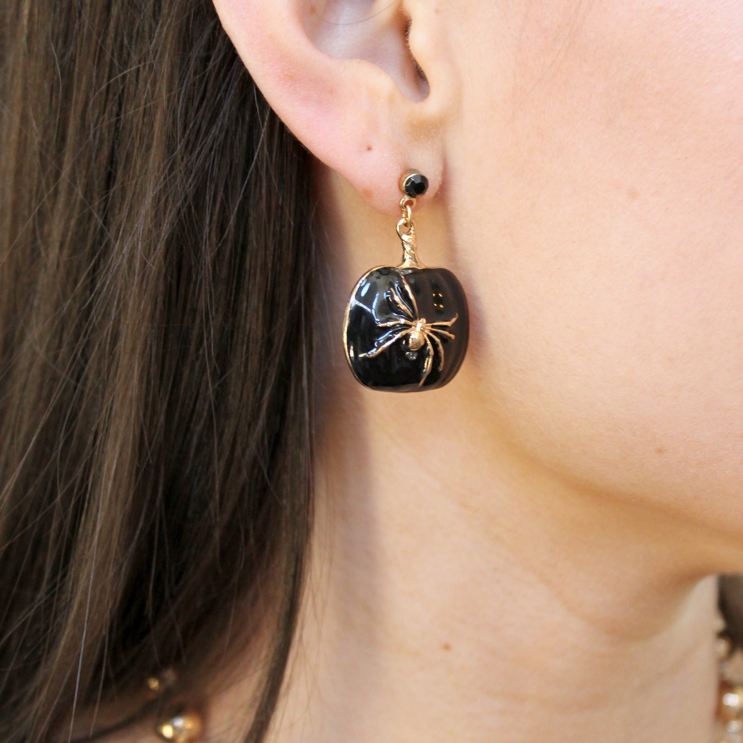 Gold tone post hook earrings featuring a black enamel Halloween pumpkin design with a spooky gold spider accent and crystals on the posts. Charms measure about an inch in width.
