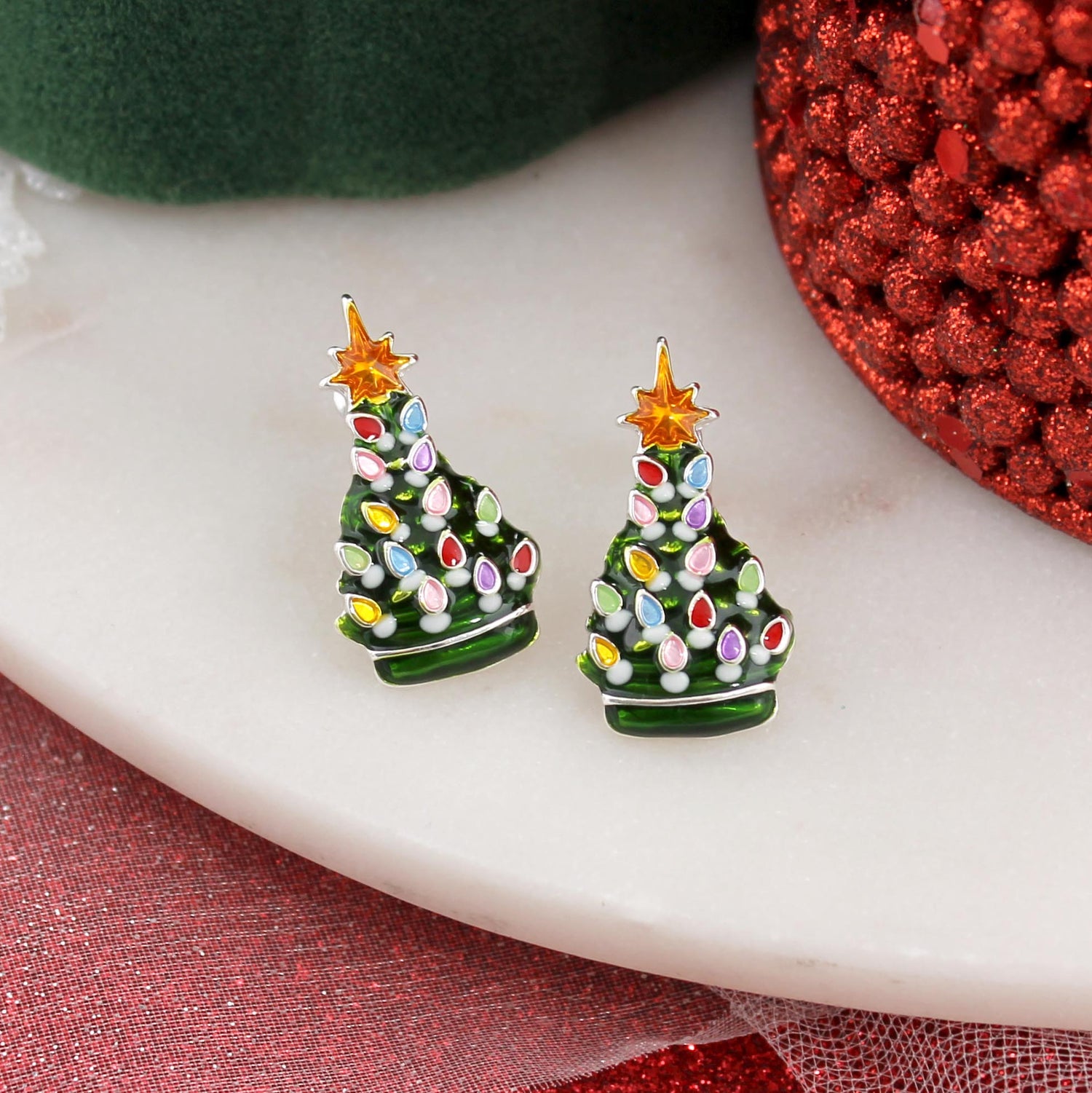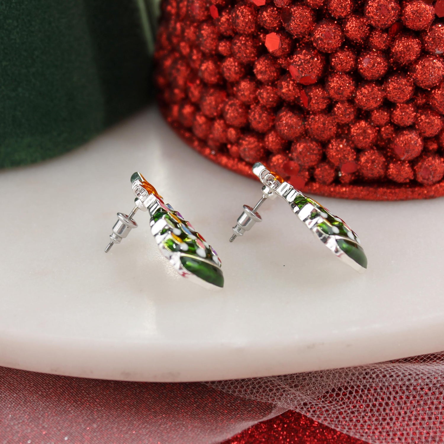 Silver tone post earrings featuring a ceramic Christmas tree design in glassy enamel. Post hooks are attached behind the star at the top. Earrings measure around 1” in height.