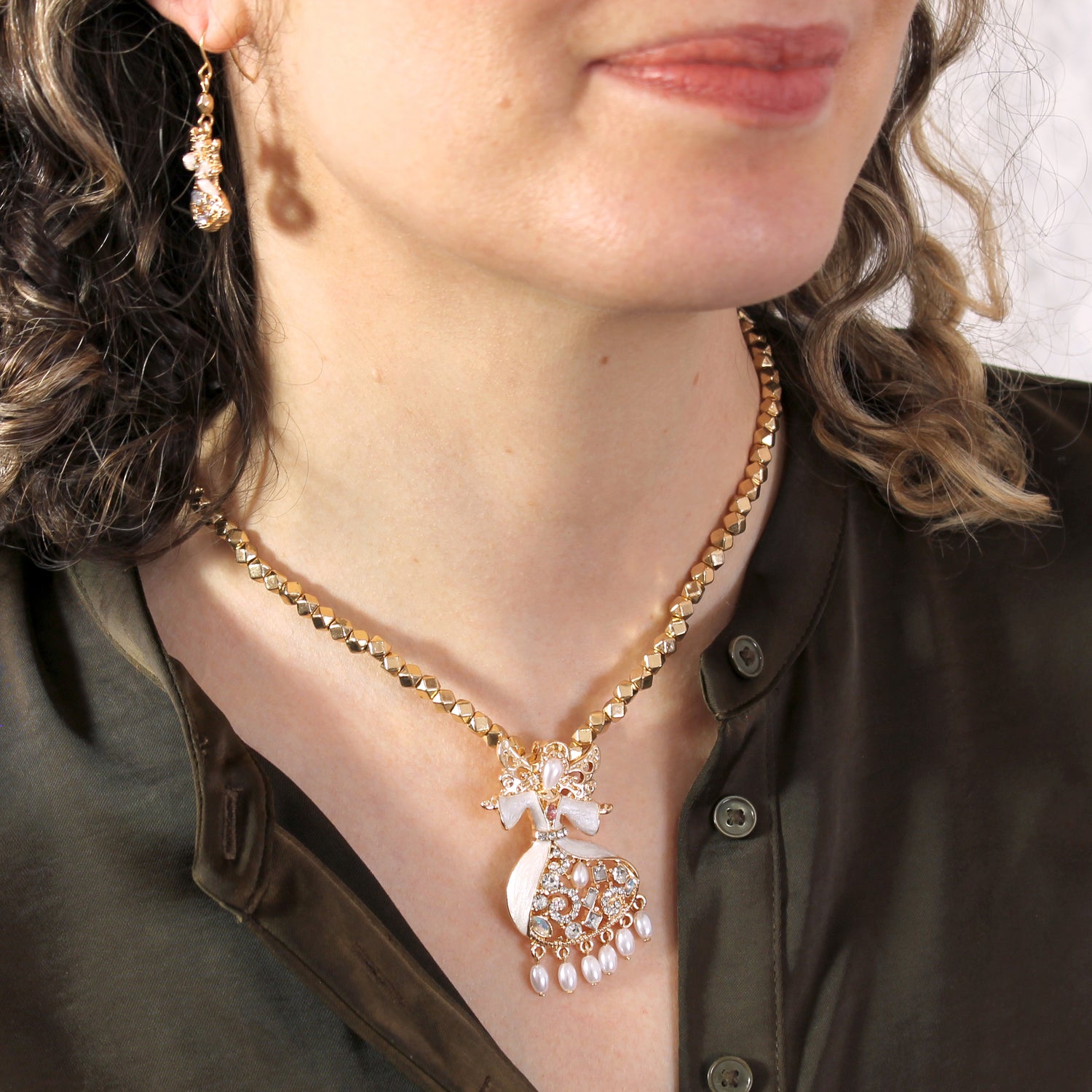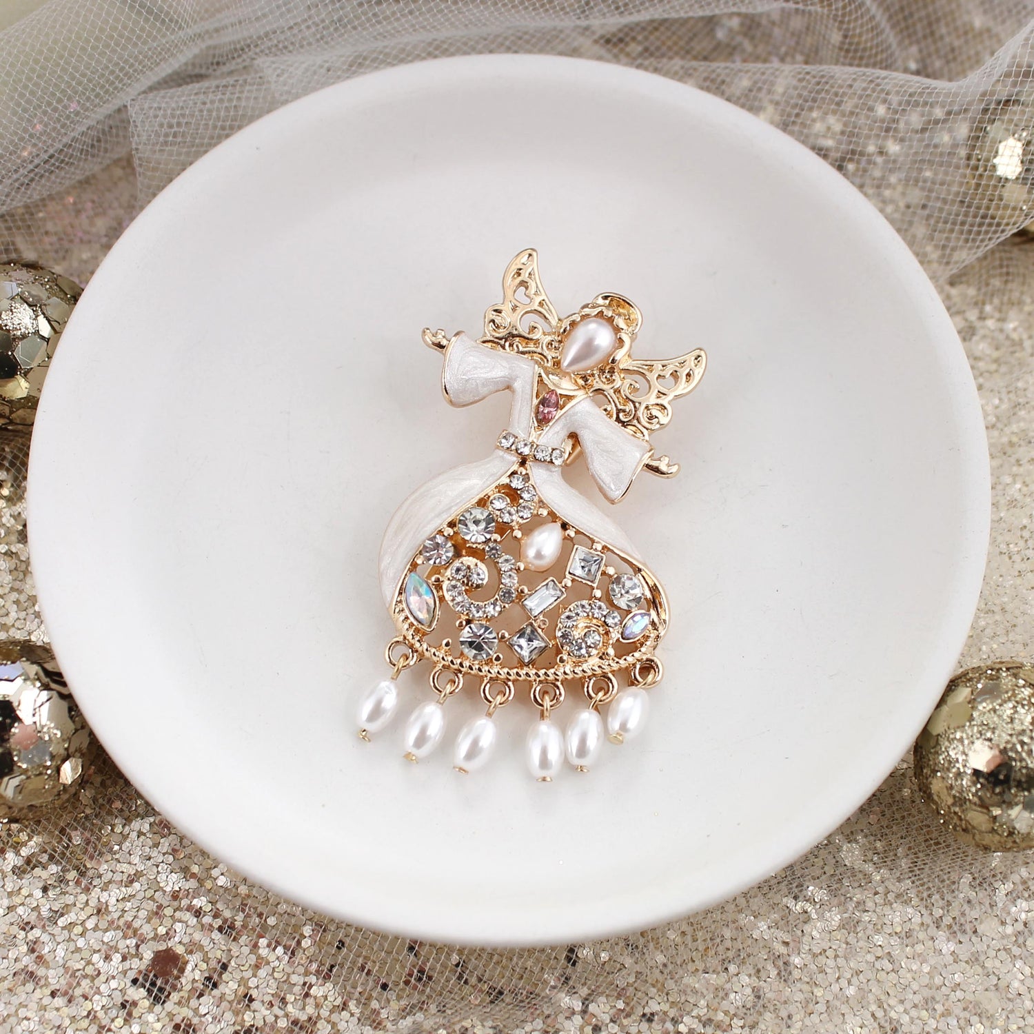 Gold tone magnetic clasp pin/pendant featuring an enamel and crystal angel with dangling pearl bead accents. Pin/pendant measures 2.25’ in height.