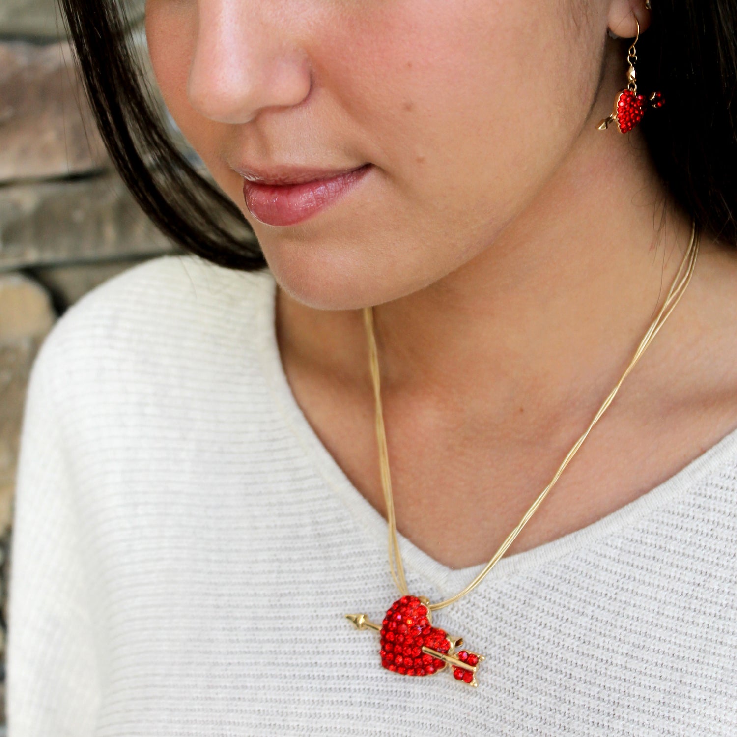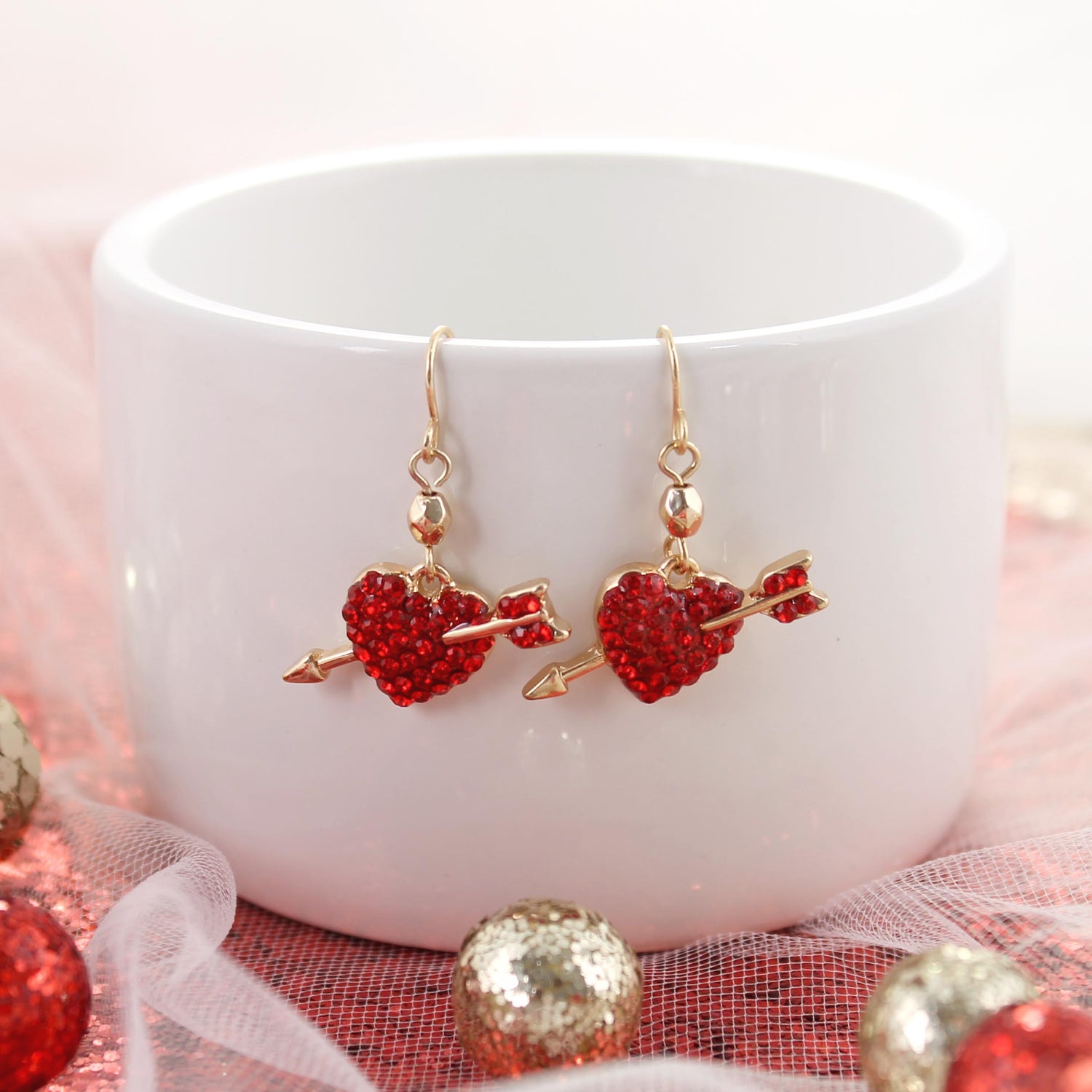 Gold tone shepherd hook earrings featuring a red crystal heart with a gold tone arrow through it. Perfect for Valentine’s Day! Heart is around a half inch in size, and arrow measures 1 inch in length.