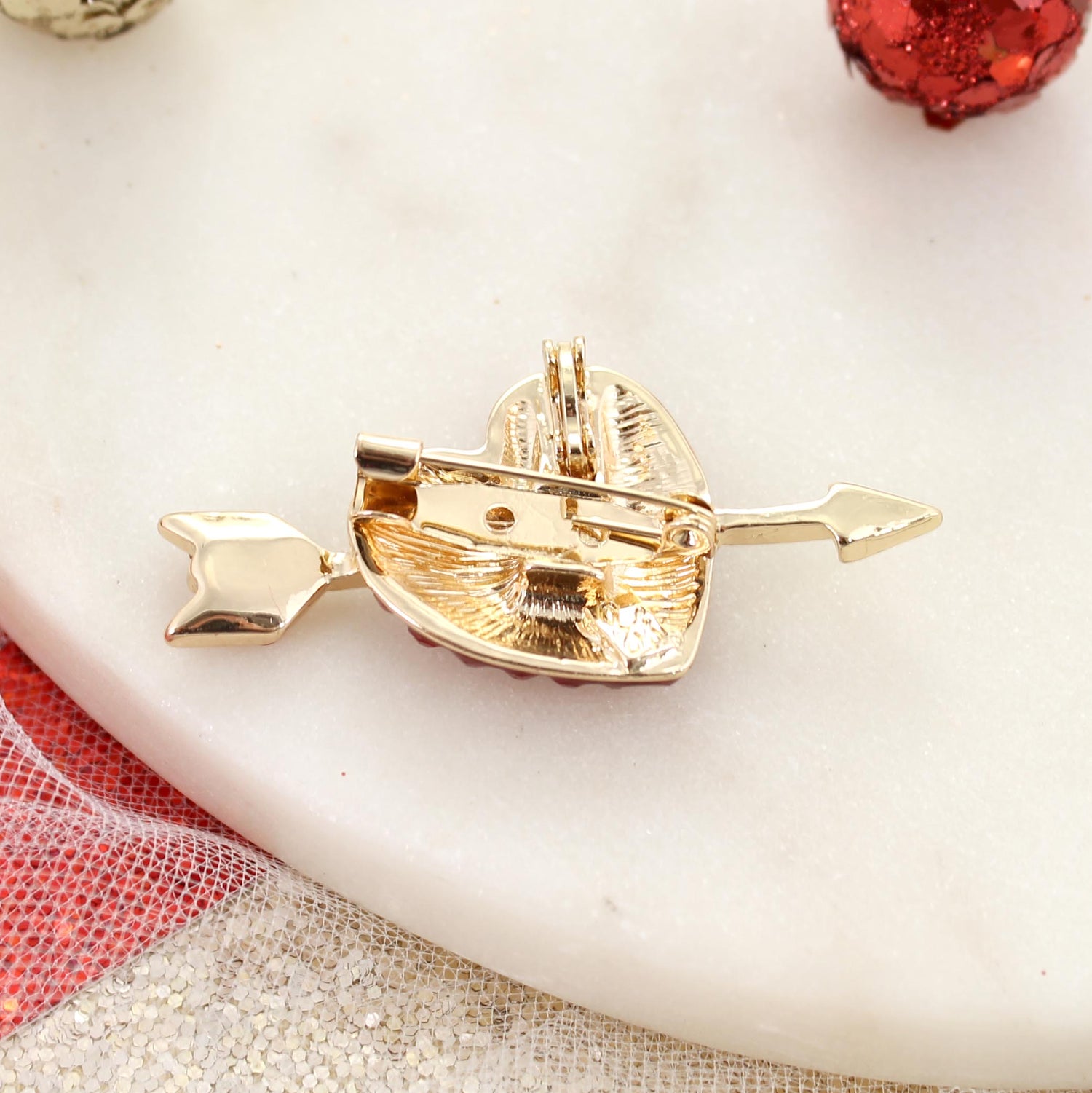 Gold tone pin/pendant featuring a red crystal heart with a gold tone arrow through it. Perfect for Valentine’s Day! Heart is around 1 inch in size, and arrow measures 2” in length. Pin/pendant features a snap hook clasp as well as pin hardware on the back.