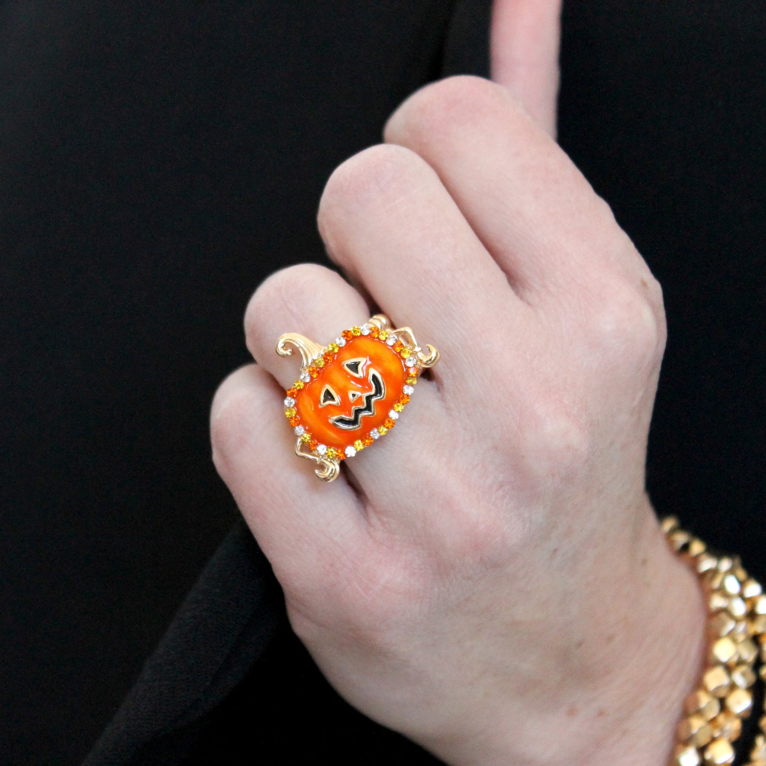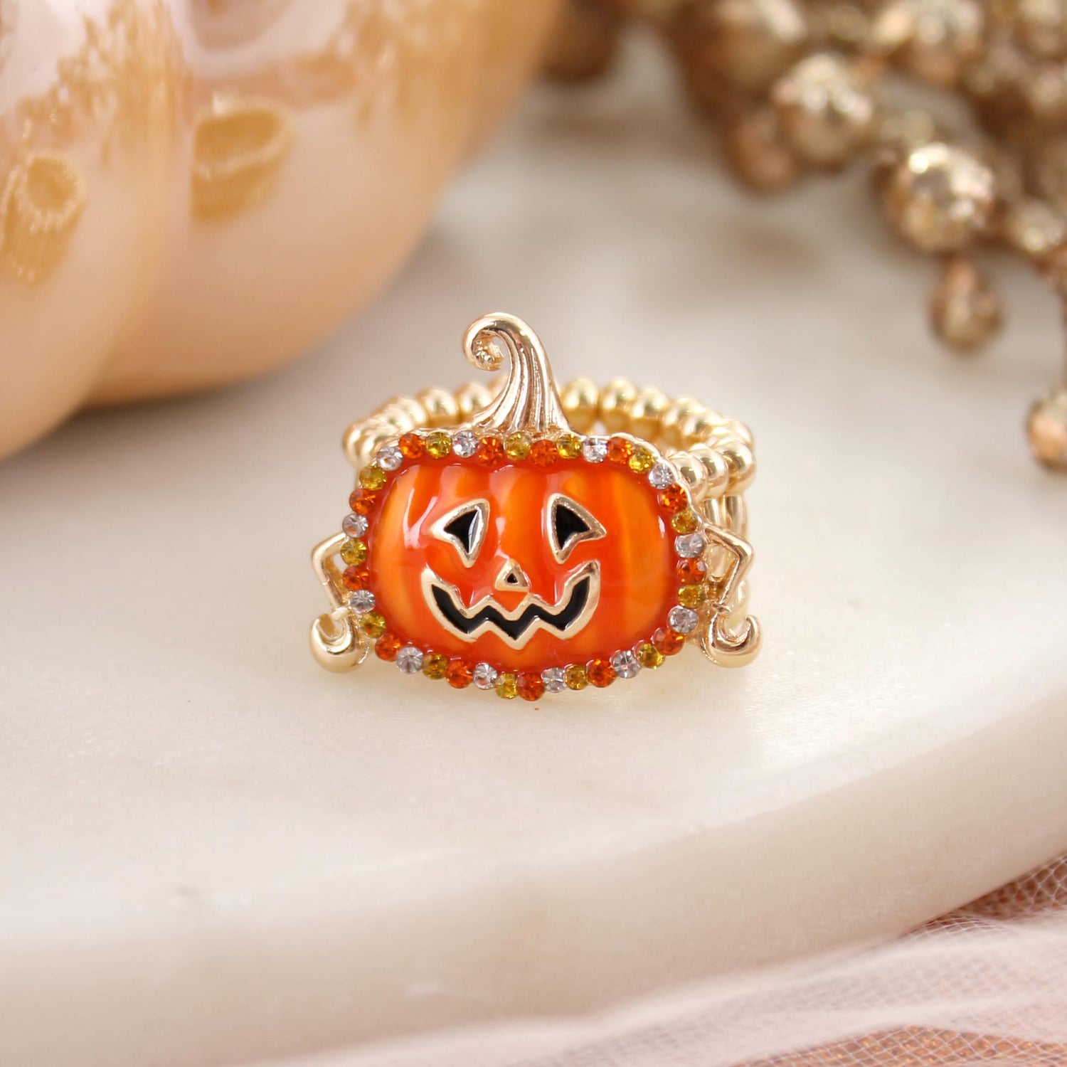 Gold tone stretch ring featuring a whimsical enamel jack-o-lantern design with candy corn colored crystal accents. Perfect for Fall and Halloween! Charm measures about 1 inch in width.