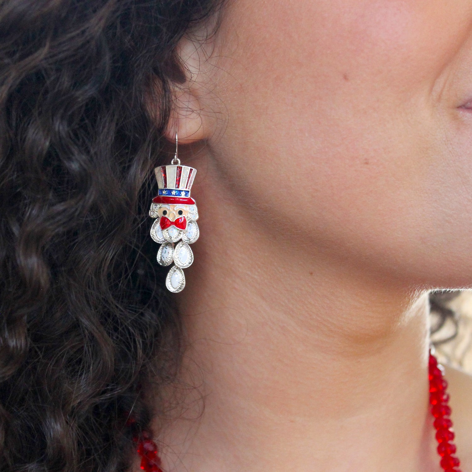 Silver tone shepherd hook 4th of July earrings featuring our fun dangle beard Uncle Sam. Charms have glitter enamel accents. Earrings measure approximately 1.5” in length.