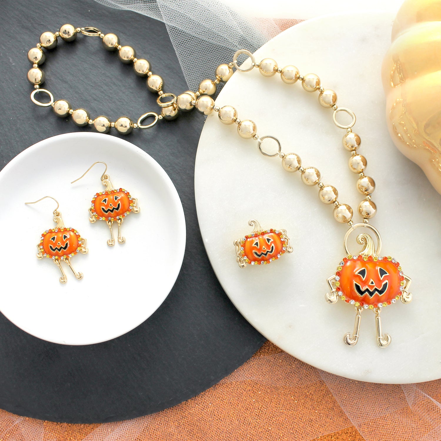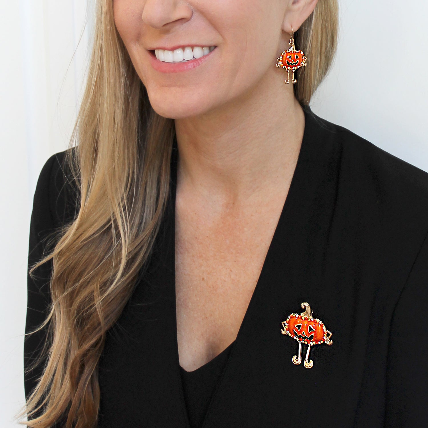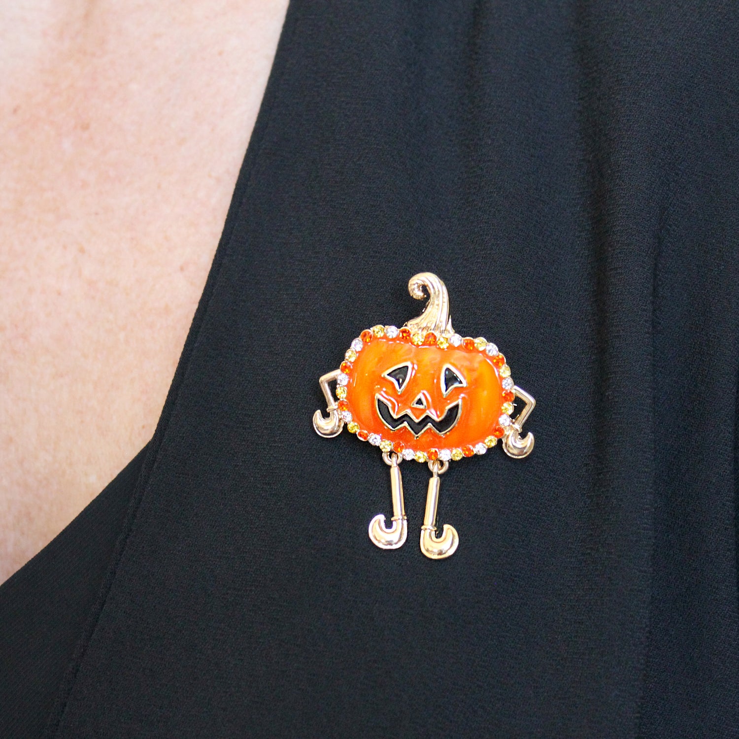 Gold tone magnetic clasp pin/pendant featuring a whimsical enamel dangle leg jack-o-lantern design with candy corn colored crystal accents. Perfect for Fall and Halloween! Pin/pendant measures approximately 2.25” in height.