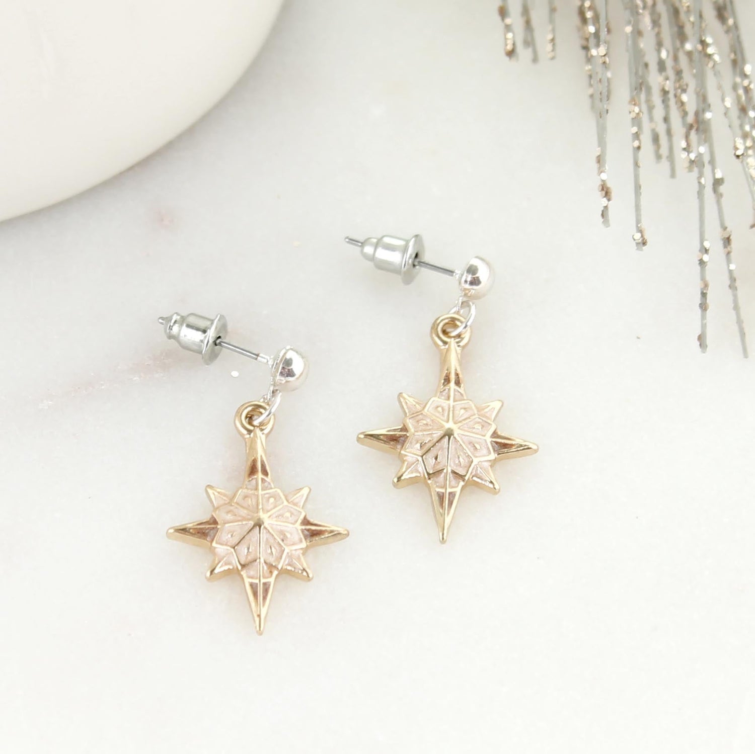 Gold tone nativity star post earrings. A classic Christmas piece! Star measures approximately 1” in height.