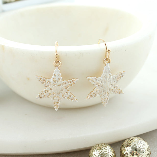 Gold tone shepherd hook earrings featuring a rustic snowflake design. Celebrate the Christmas season and beyond with this eye-catching design! Snowflakes measure about an inch in diameter.