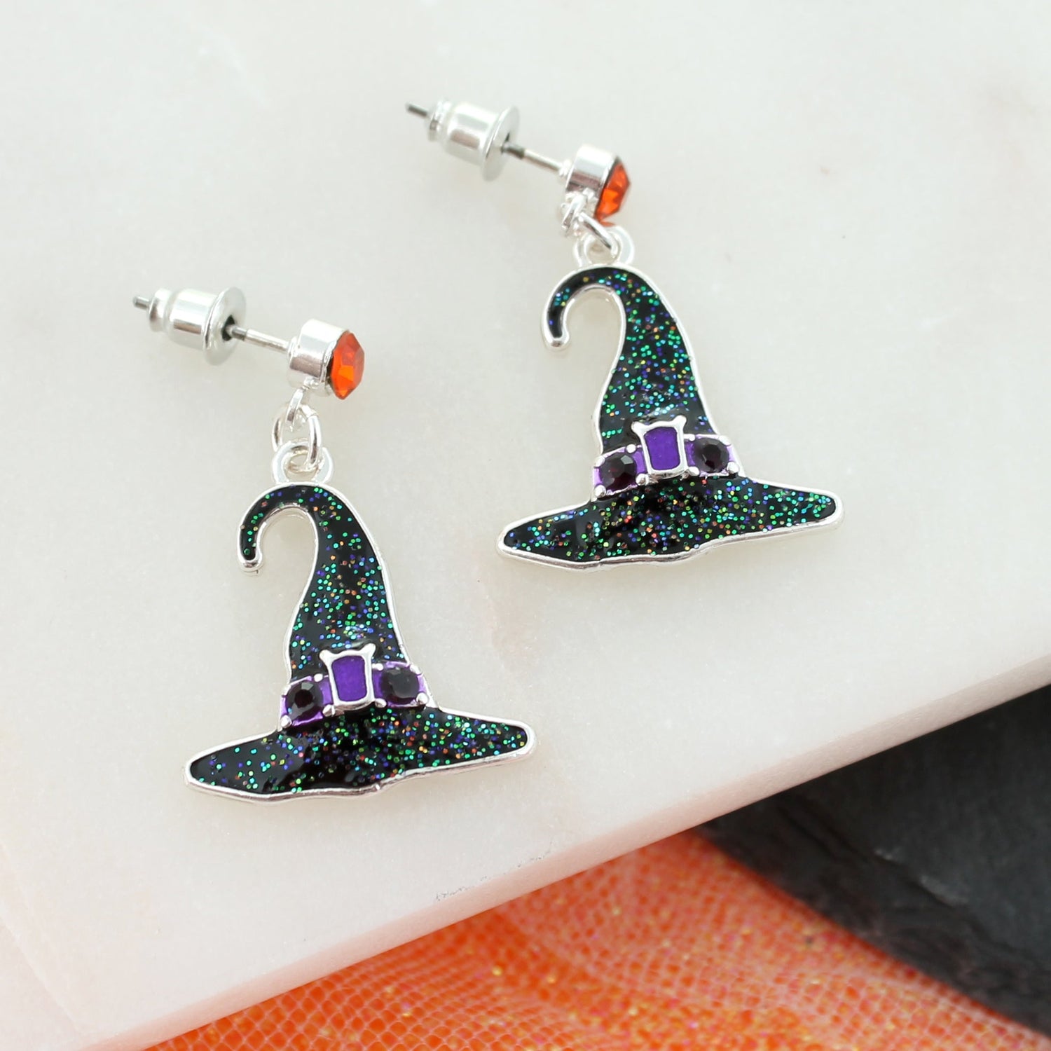 Silver tone post hook earrings featuring a glitter enamel witch hat design. The perfect amount of Halloween whimsy! Hat measures about 2 cm in width.
