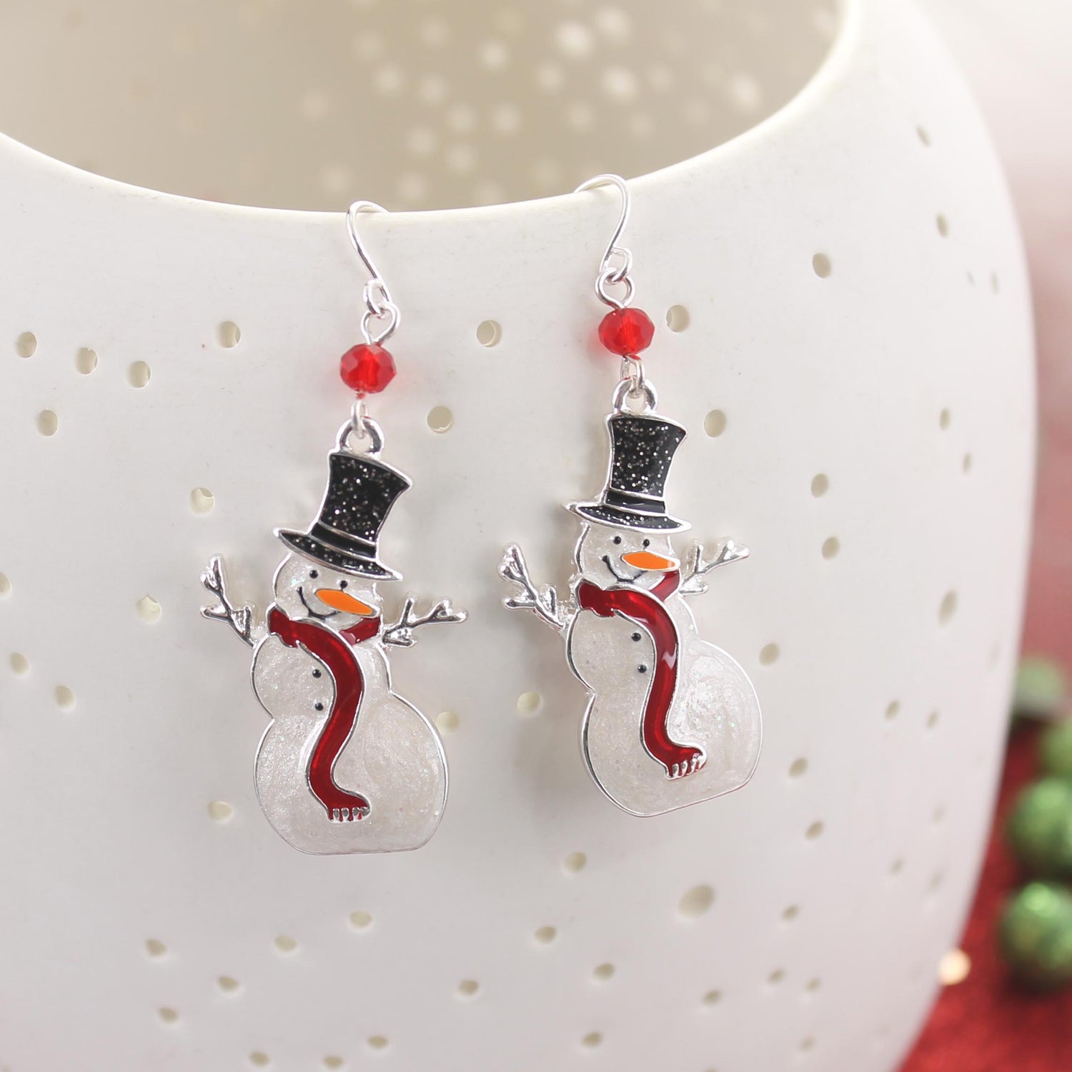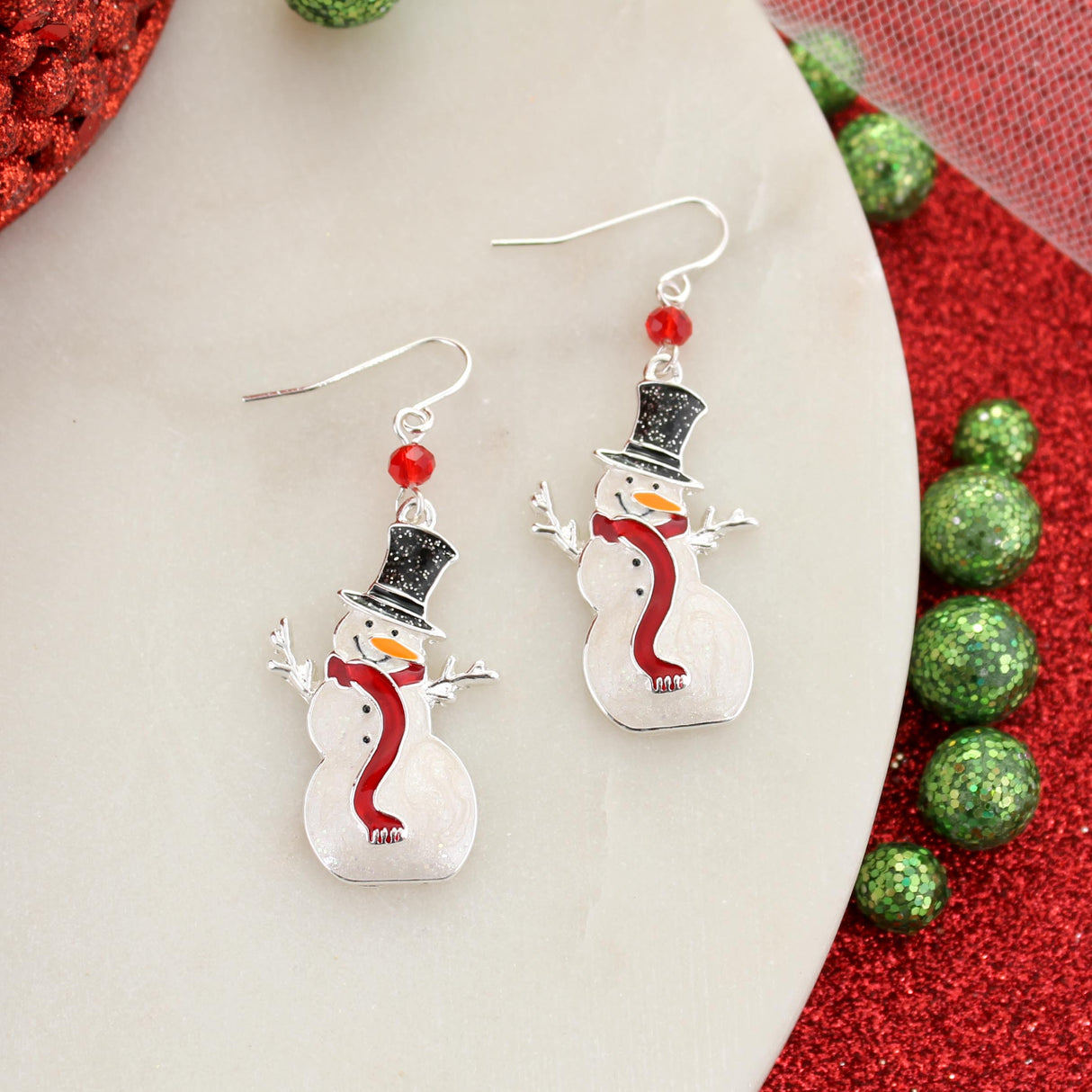 Silver tone shepherd hook earrings featuring a frosted enamel snowman with glitter enamel and crystal accents. Perfect for Winter and Christmas! Snowman charms measure around 1.25” in height.