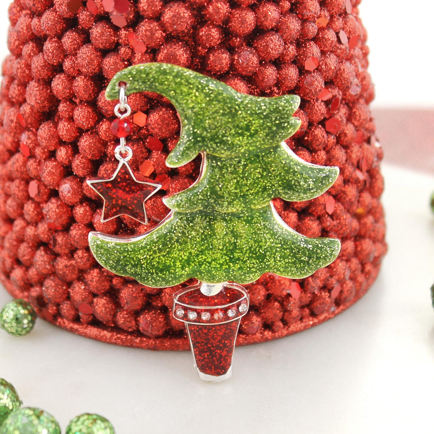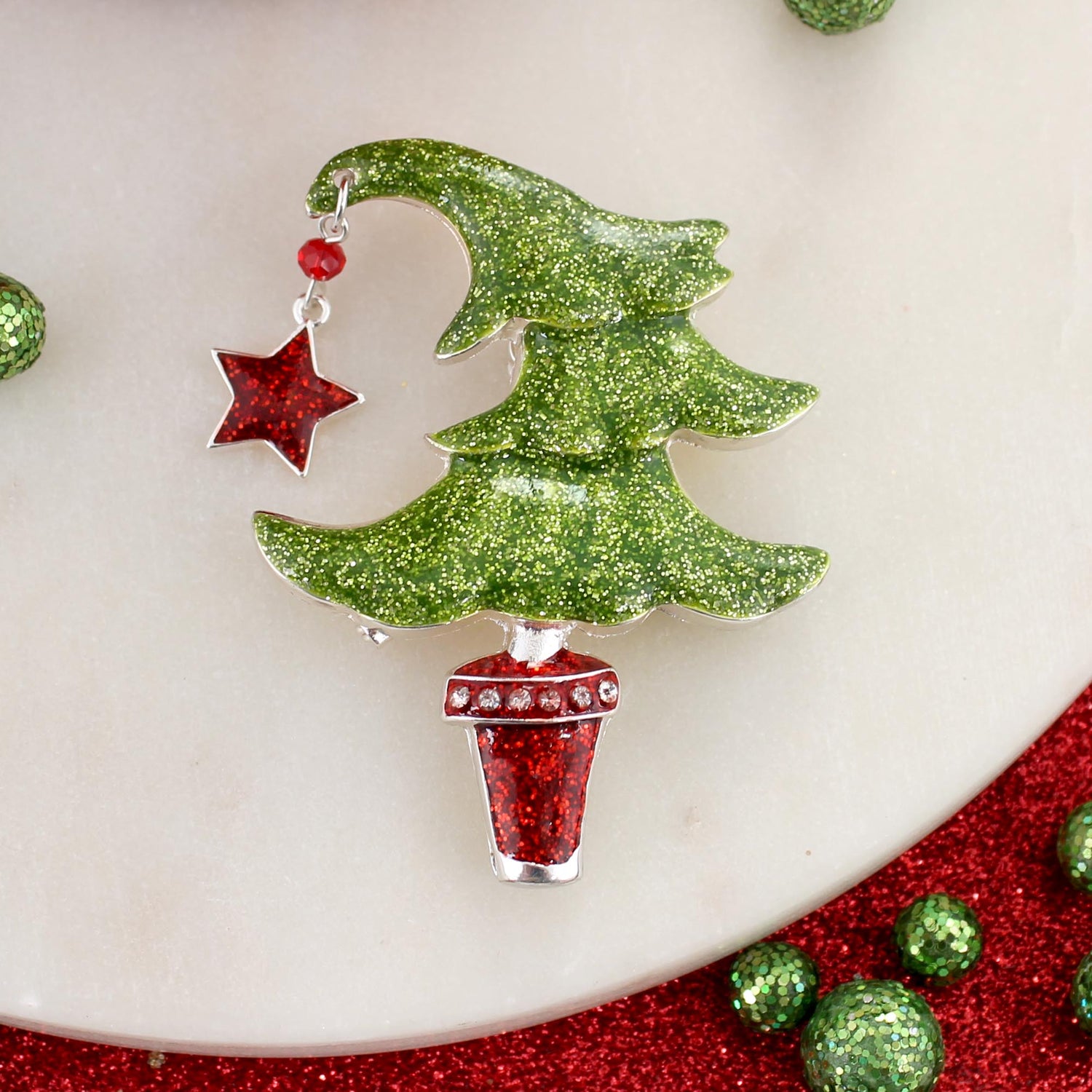 Silver tone magnetic clasp pin/pendant featuring a glitter enamel Christmas tree with a dangling star accent. Pin/pendant measures around 2.5” in height.