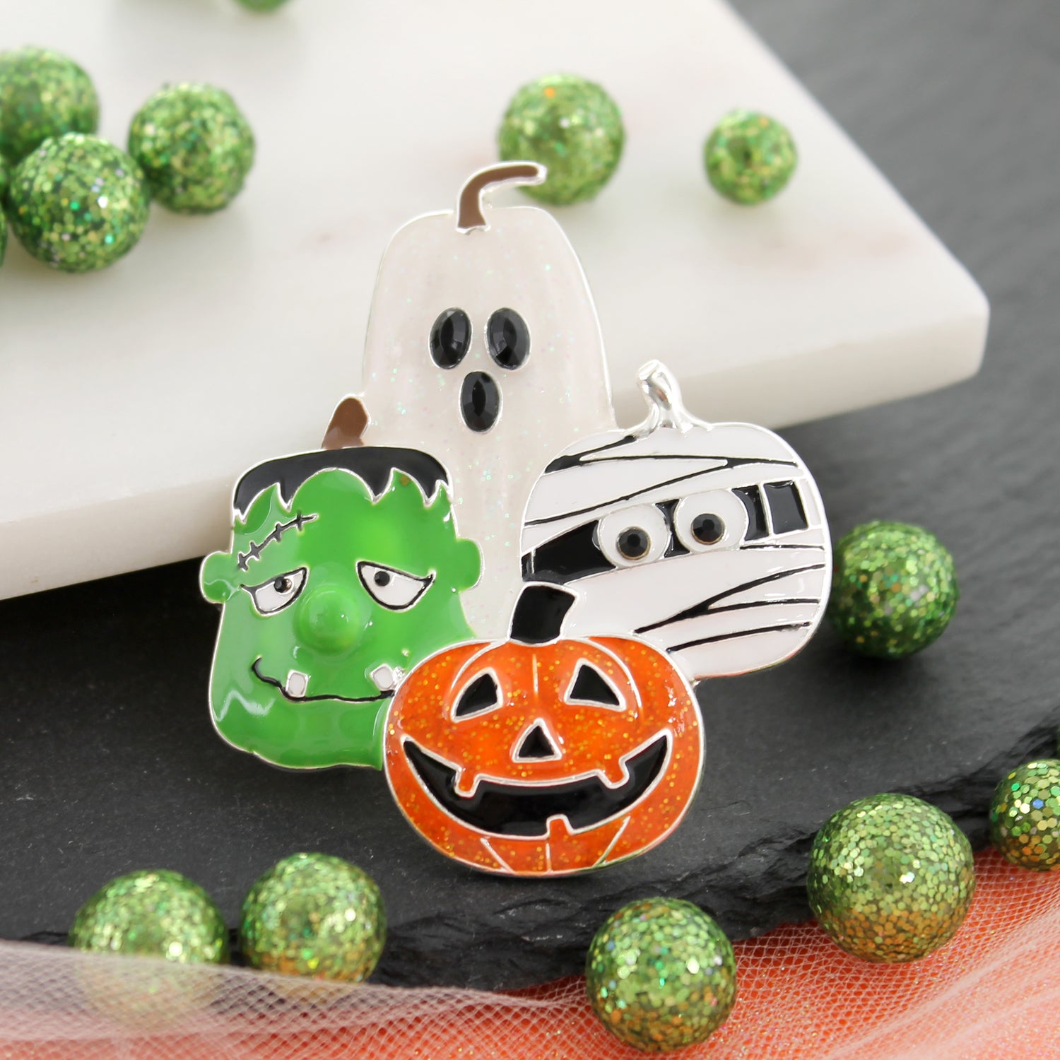 Silver tone magnetic clasp pin/pendant featuring a Halloween pumpkin gang. Four enamel pumpkins make up a monster, ghost, mummy, and jack-o-lantern with glitter and crystal accents. Pin/pendant measures about 2” in width.