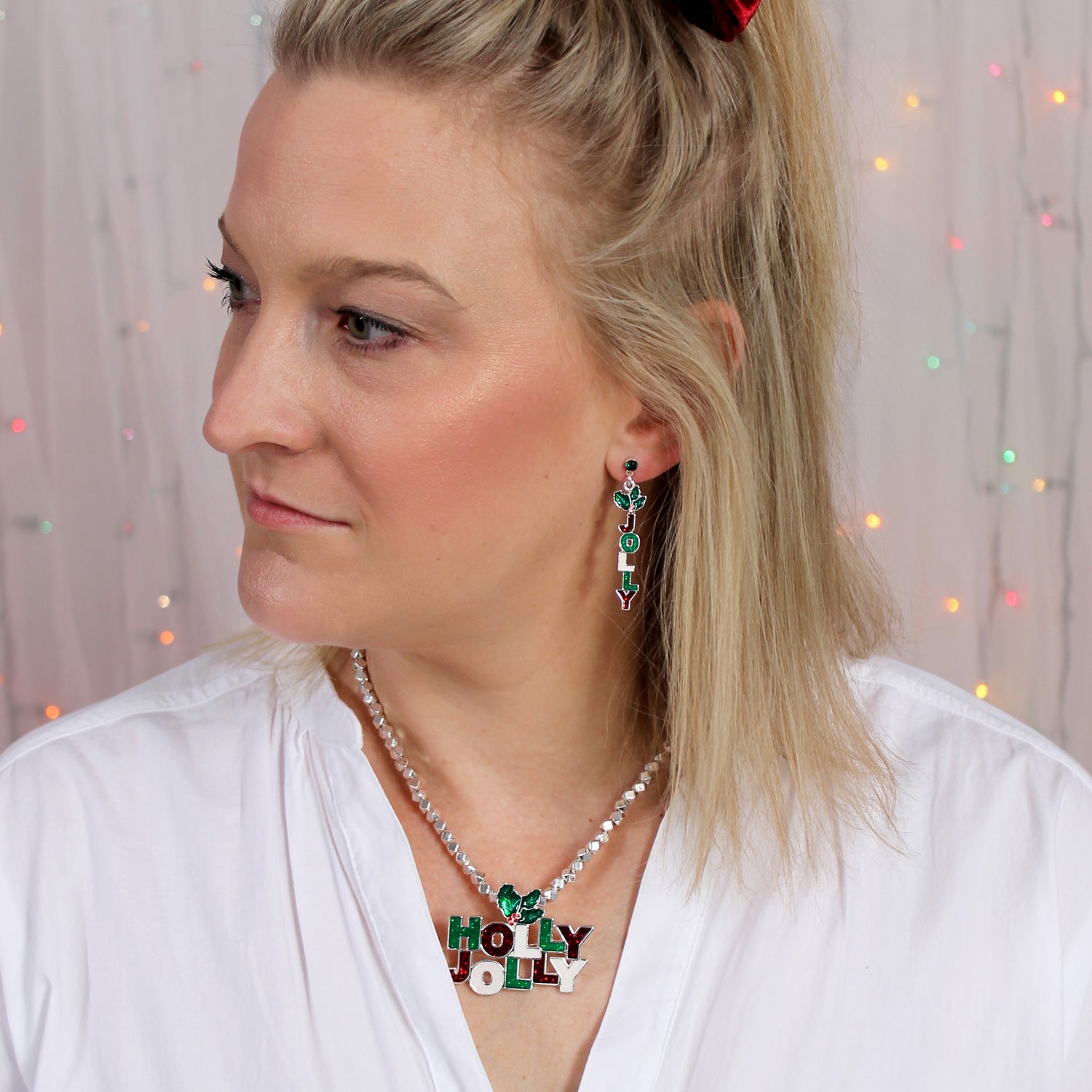 Silver tone magnetic clasp pin/pendant featuring the words “Holly Jolly” in glitter enamel with crystal accents. Pin/pendant measures approximately two inches in width.