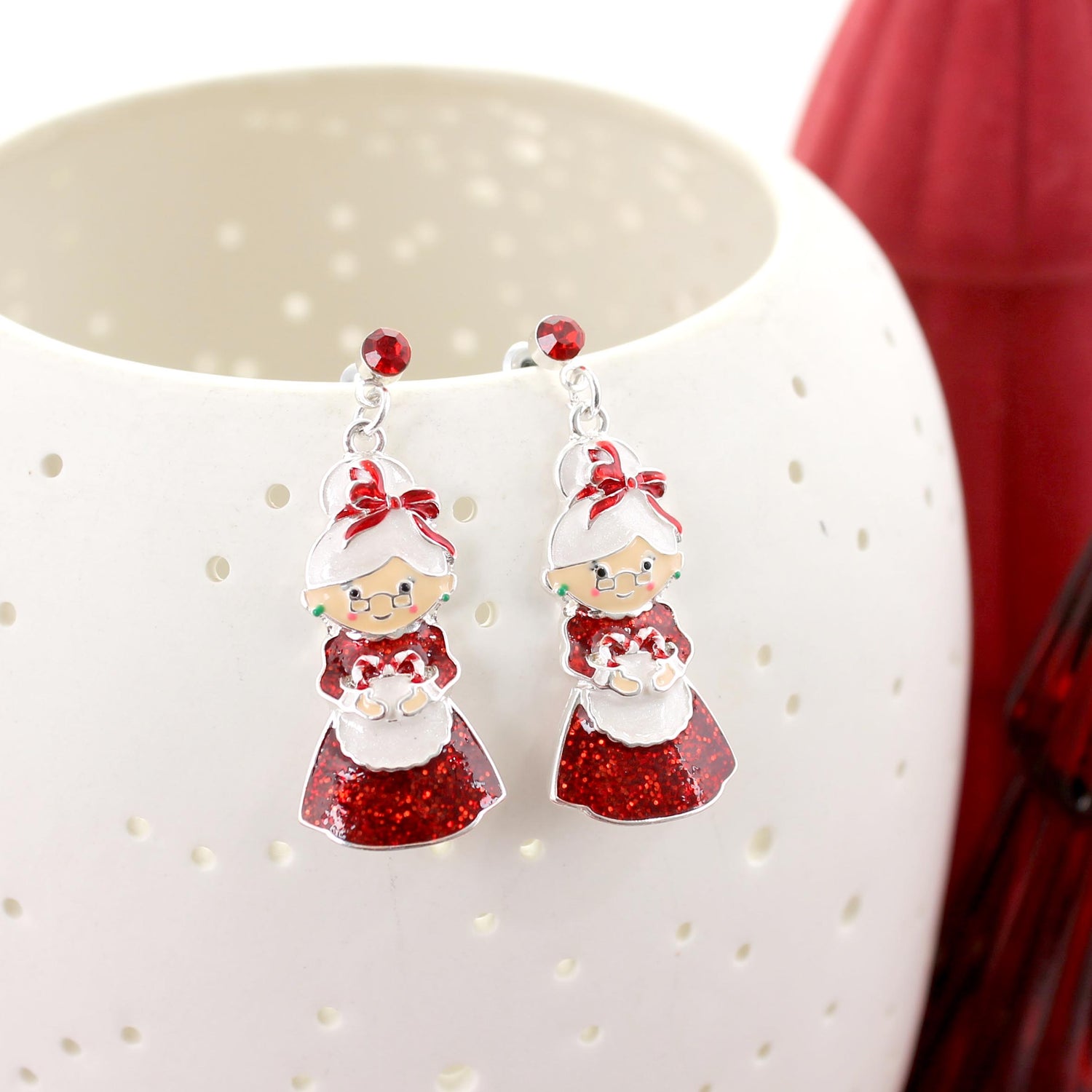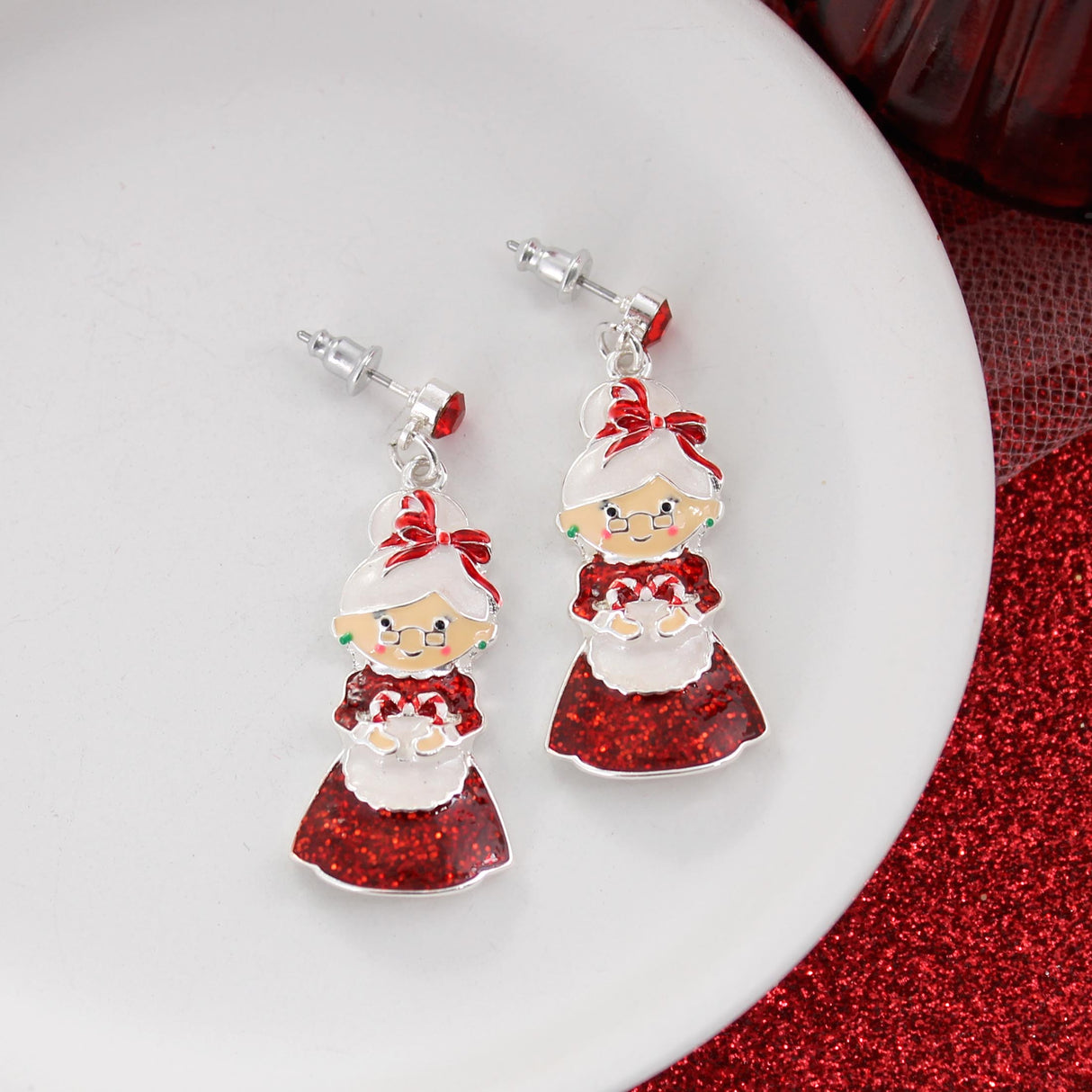 Silver tone post hook earrings featuring a glitter enamel Mrs. Claus design with crystal accents. Perfect for Christmas! Charms measure around 1.25” in height.