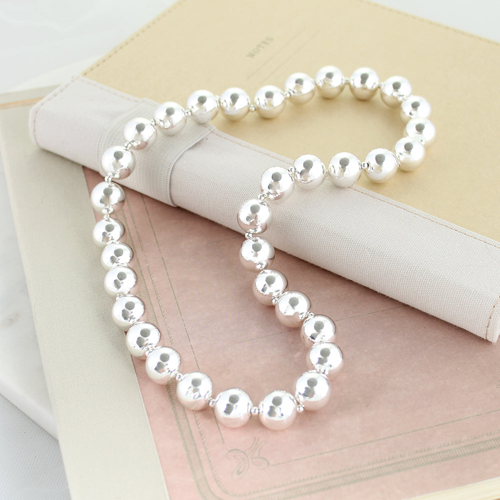 18" stretch necklace featuring silver beads. No need to fumble with a clasp; this is the epitome of easy on/easy off! Pairs excellent with our holiday pendant/pins!