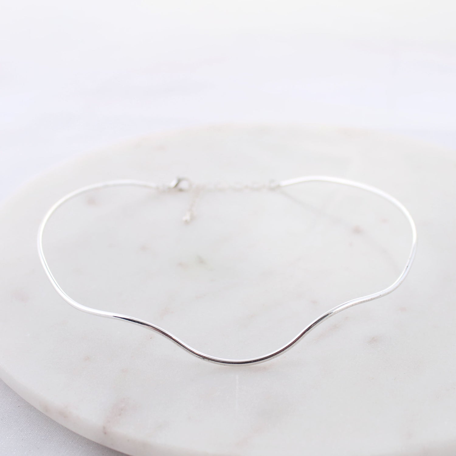 Silver tone heart style neck wire. 5” in diameter, with a claw clasp and 2” connector chain.