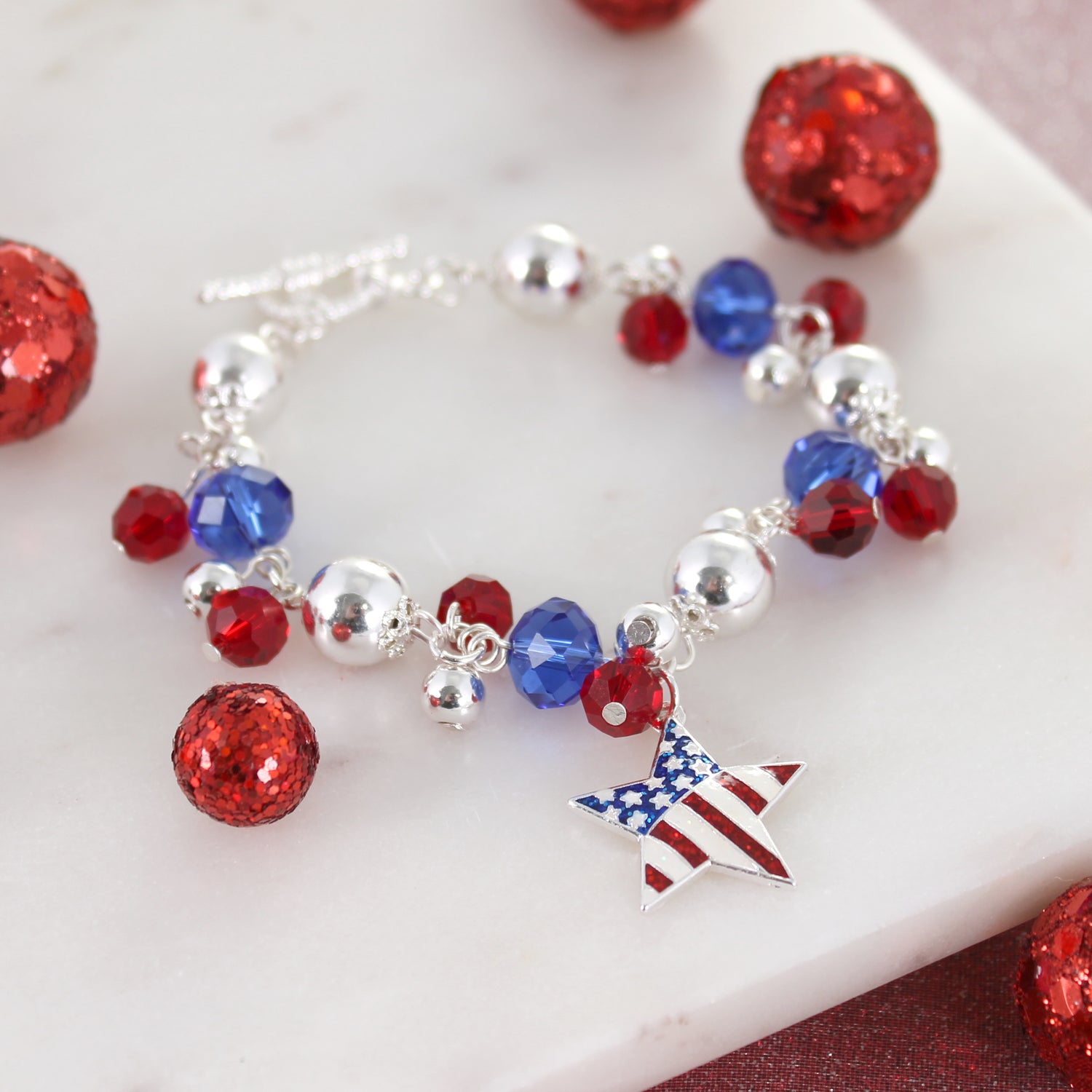 Silver tone toggle clasp bracelet featuring red and blue crystal beads with silver round beads and a patriotic 1” star charm with an enamel USA flag pattern. Perfect for the 4th of July!