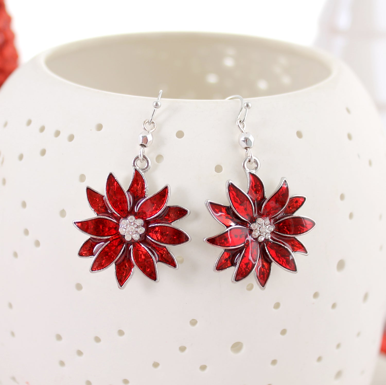 Silver tone shepherd hook earrings featuring an enamel poinsettia with crystal accents. Poinsettia measures around 1" in size.