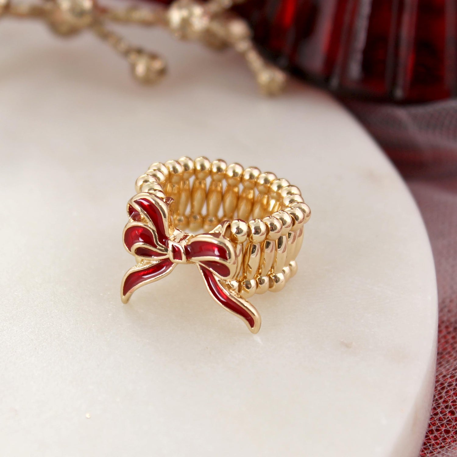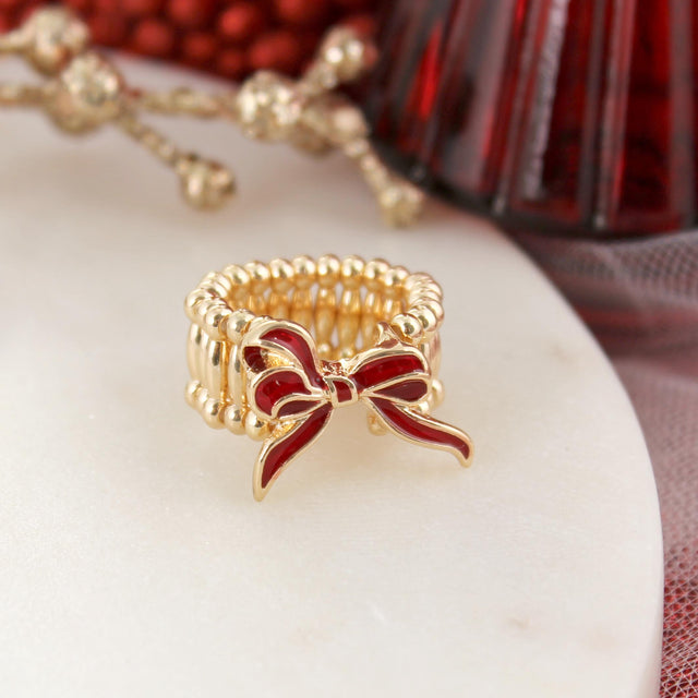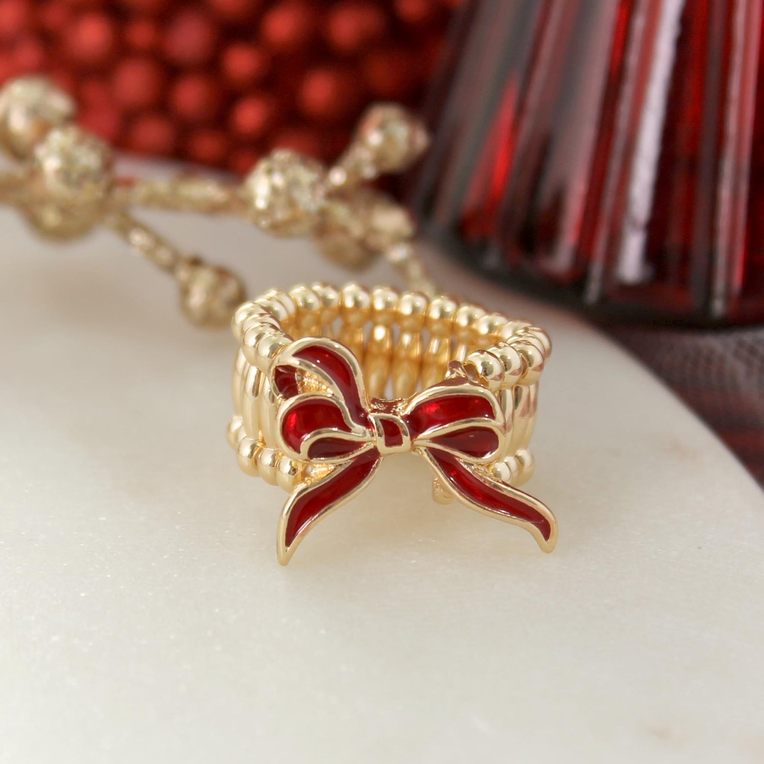 Gold tone stretch ring featuring a glassy red enamel bow. Perfect for Christmas! Bow measures about an inch in width.