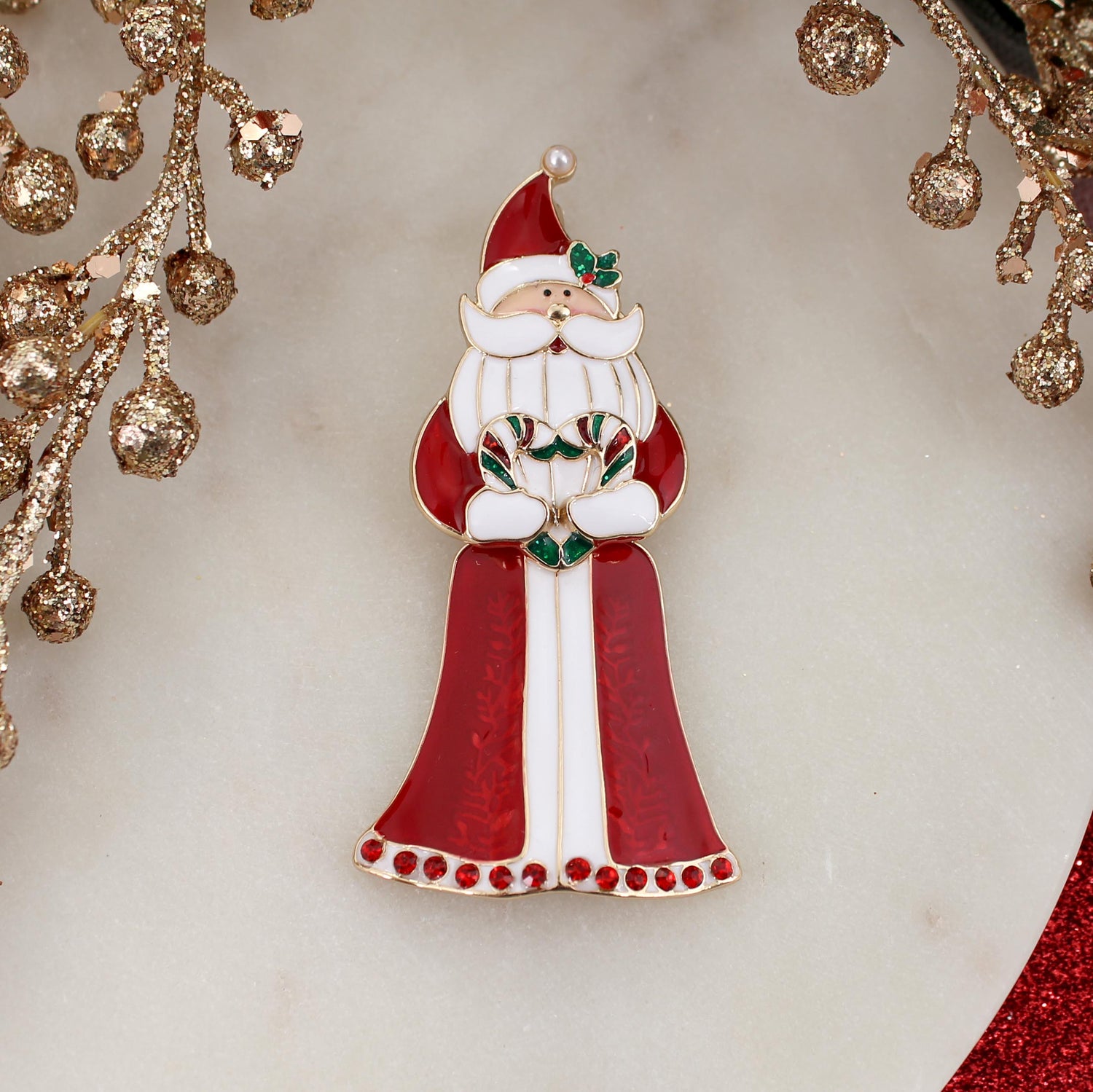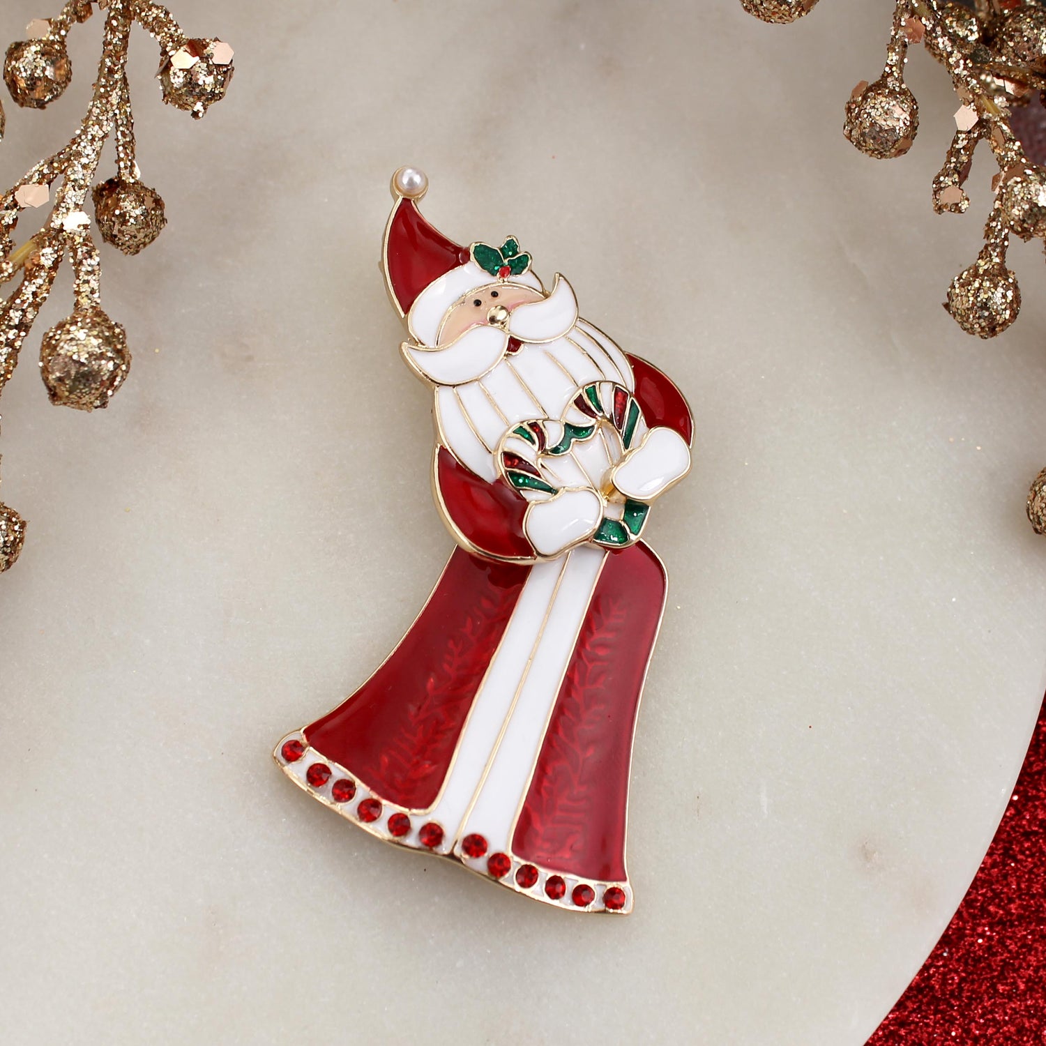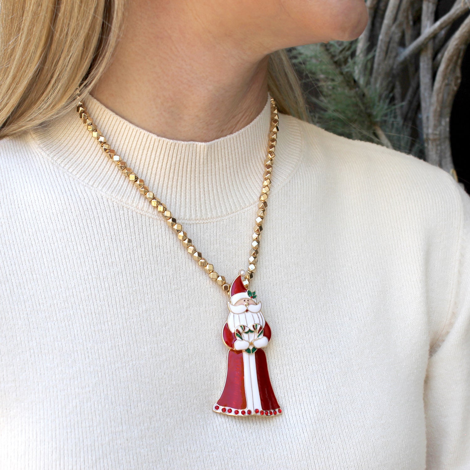 Gold tone magnetic clasp pin/pendant featuring an enamel Saint Nick design. Bottom half dangles and features crystal accents. Perfect for Christmas! Pin/pendant measures just over 3” in height.