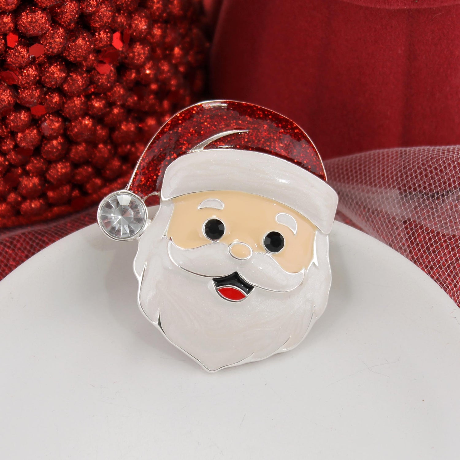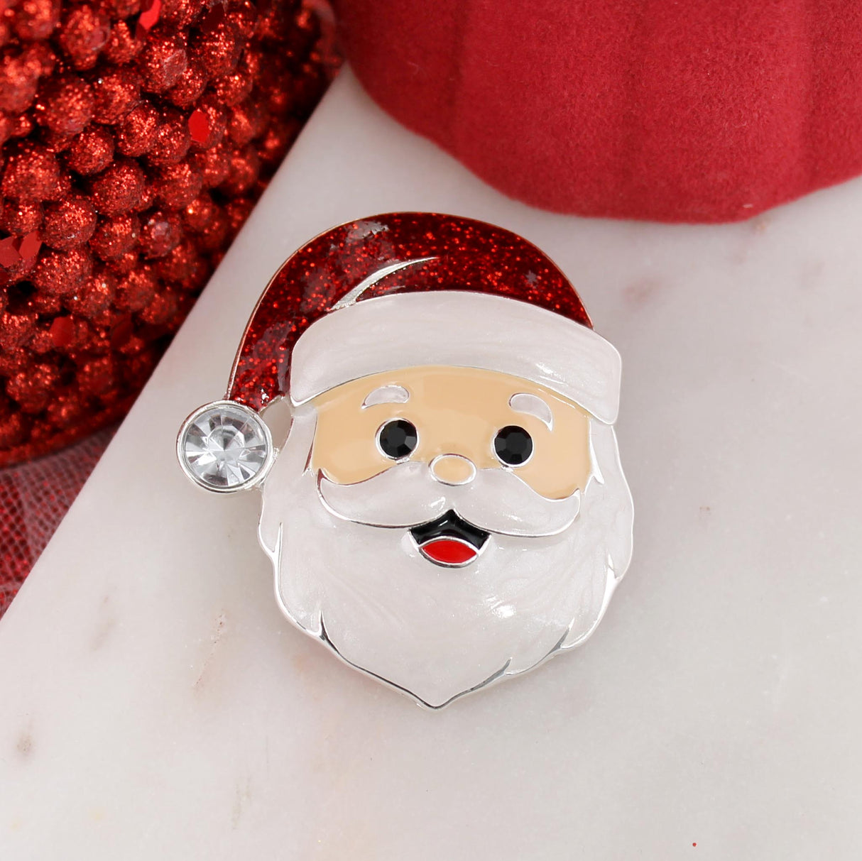 Silver tone magnetic clasp pin/pendant featuring a Santa face with glitter enamel and crystal accents. Perfect for Christmas! Pin/pendant measures around 2” in height.