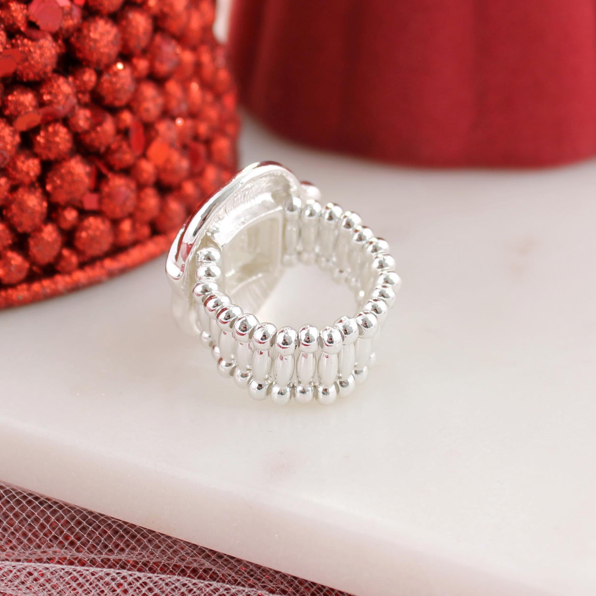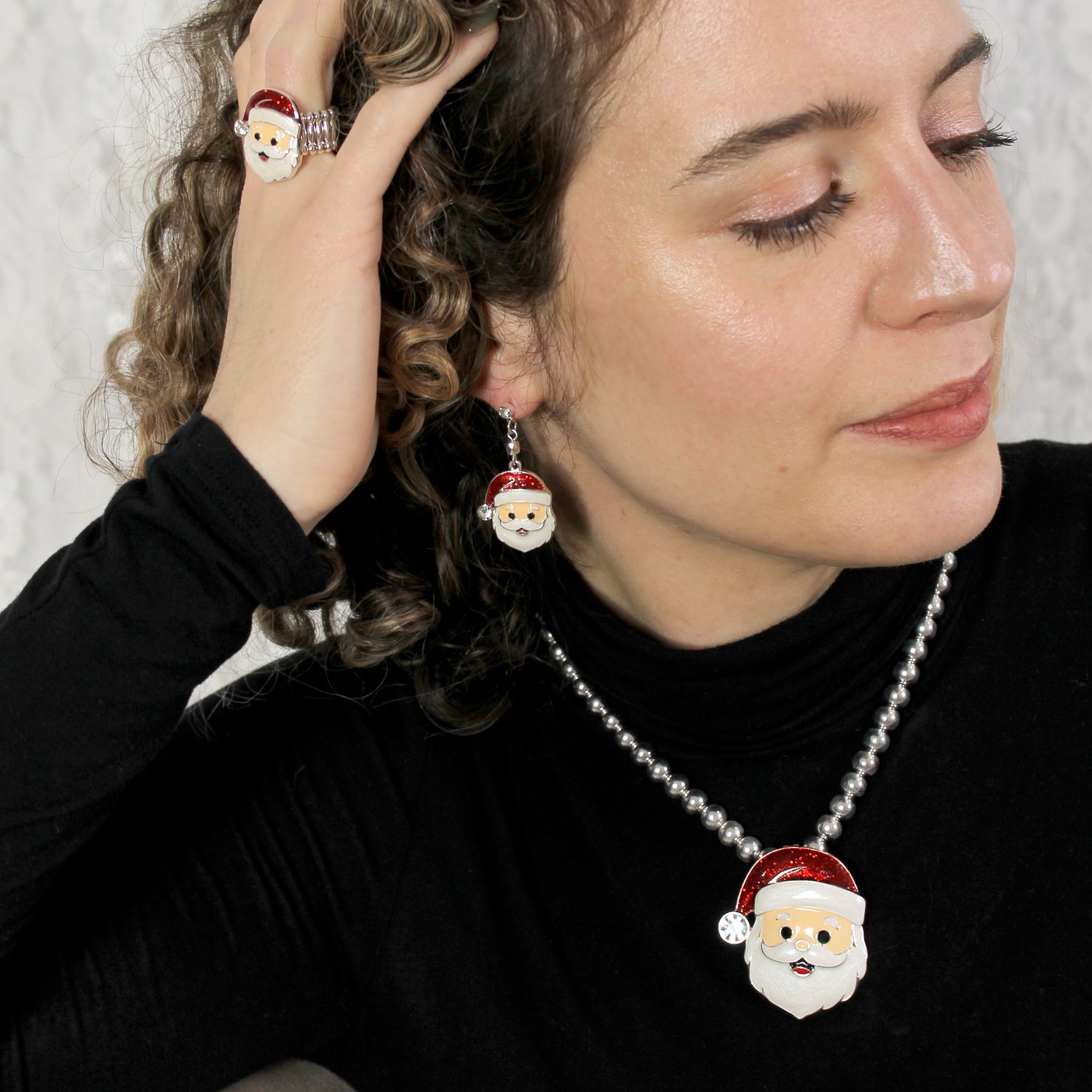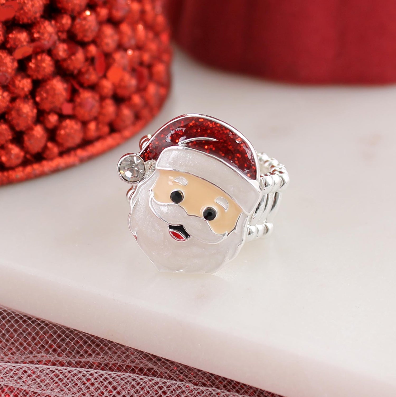 Silver tone stretch ring featuring an enamel Santa face with crystal accents. Perfect for Christmas! Charm measures about 1” in height.