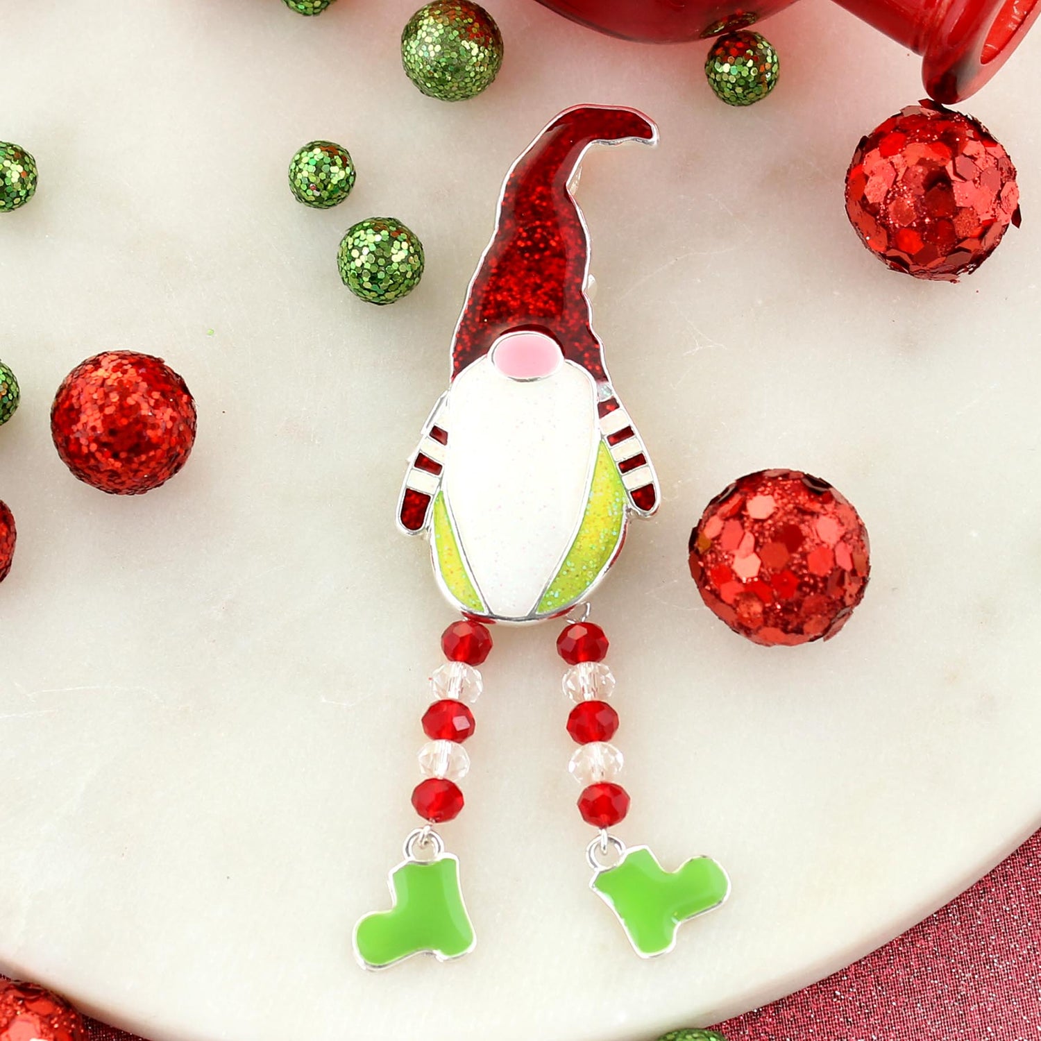 Silver tone magnetic clasp pin/pendant featuring a dangle leg gnome design with glitter enamel and crystal bead accents. The perfect, whimsical Christmas accessory! Pin/pendant measures approximately 4”in height.