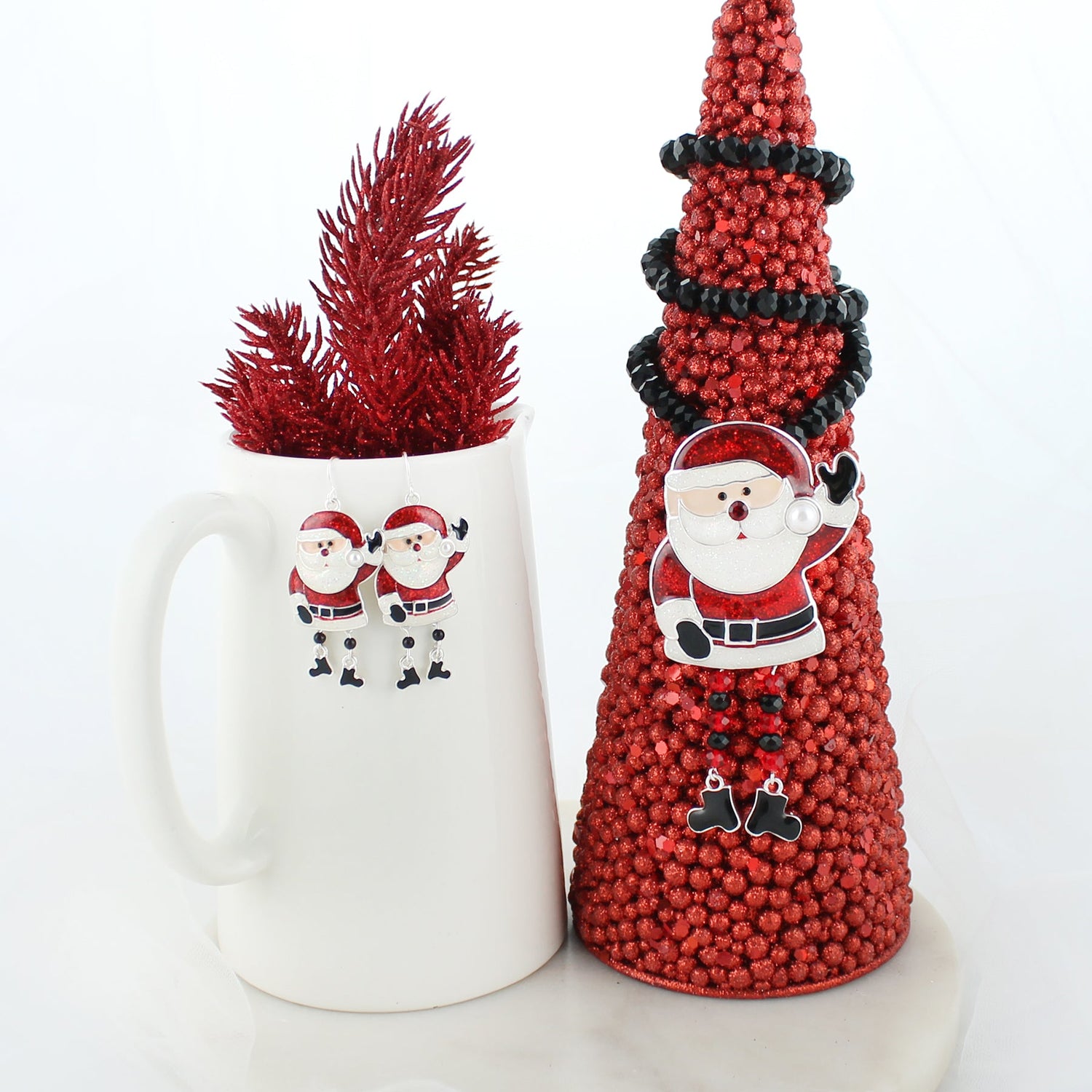Silver tone Christmas pin/pendant featuring a glitter enamel Santa Claus with crystal and imitation pearl accents, and beaded dangle legs. Pin/pendant measures 3.75” in height, including dangle leg length.